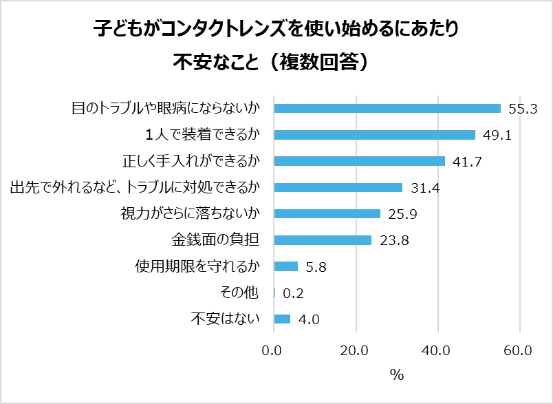 子どもがコンタクトレンズを使い始めるにあたっての不安を聞いたところ、96.0%は何かしらの不安があると回答。特に「目のトラブルや眼病にならないか(55.3%)」「1人で装着できるか(49.1%)」「正しく手入れができるか(41.7%)」を心配する親が多いことが分かりました。