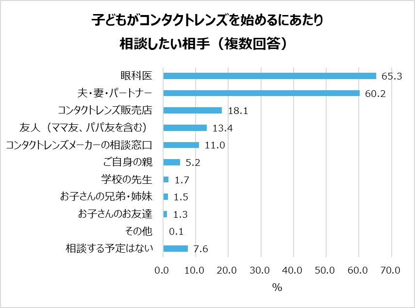 コンタクトレンズに限らず、新しいことを始める際は誰かに相談することも大切です。子どもがコンタクトレンズを始めるにあたり相談したい相手を聞いたところ、1位は「眼科医(65.3%)」でした。2位は「夫・妻・パートナー(60.2%)」、3位は「コンタクトレンズ販売店(18.1%)」、4位は「友人(ママ友、パパ友を含む)(13.4%)」で、専門家と身近な人の両方に相談したい親が多いと考えられます。