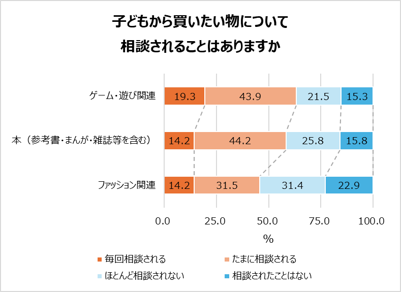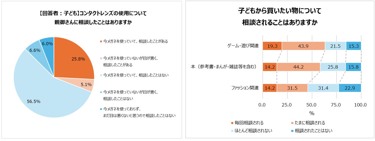 コンタクトレンズを使用したい子どもが6割以上いた一方で、親にコンタクトレンズの使用を相談したことがある子どもの割合は約3割にとどまる結果となりました。また、親に対して、普段子どもから買いたい物について相談されることがあるか聞いたところ、「ゲーム・遊び関連」「本(参考書・まんが・雑誌等を含む)」と比べると、「ファッション関連」は相談している子どもが少ないことも分かりました。身に着けるものや、見た目・おしゃれに関わる相談がなかなか自分からできない子どもに対しては、親から話を持ち掛けてみるのも良いかもしれません。
