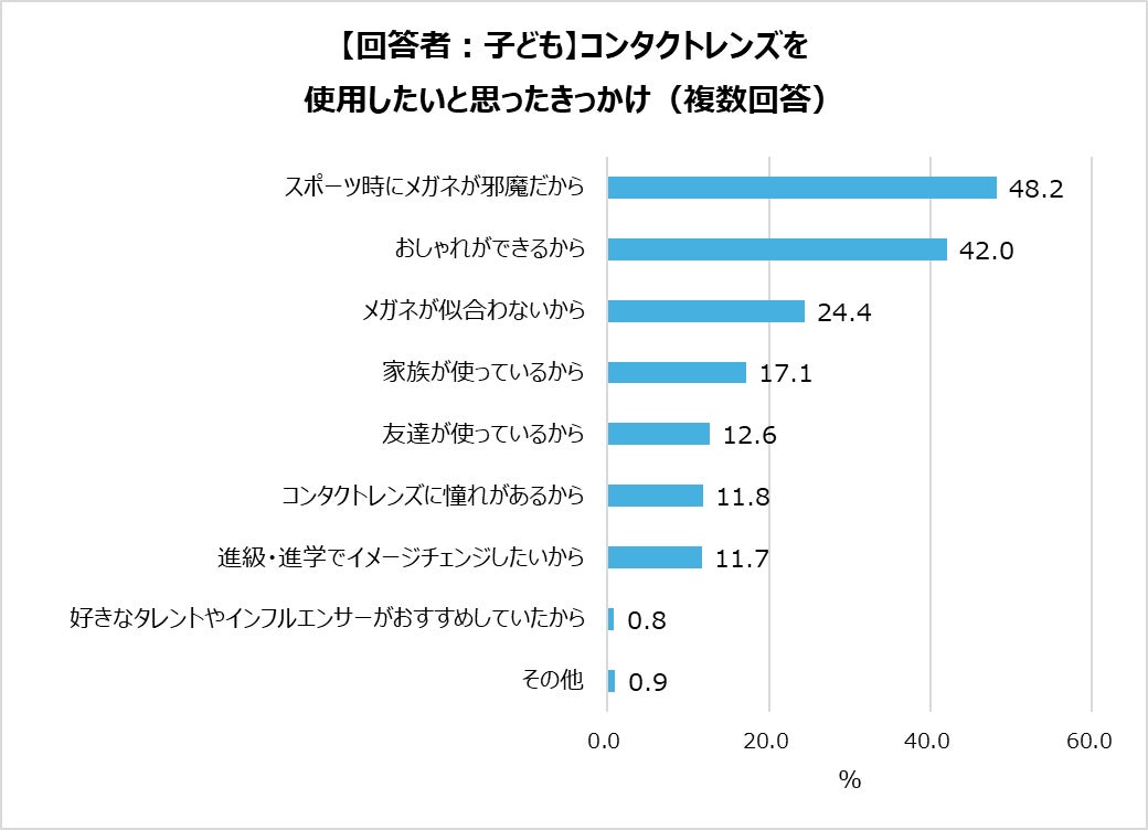 コンタクトレンズを使用したいと思ったきっかけの1位は「スポーツ時にメガネが邪魔だから(48.2%)」でした。学校の授業での経験も理由となっているのかもしれません。「おしゃれができるから(42.0%)」と回答した子どもも4割以上おり、思春期らしいきっかけも垣間見えました。