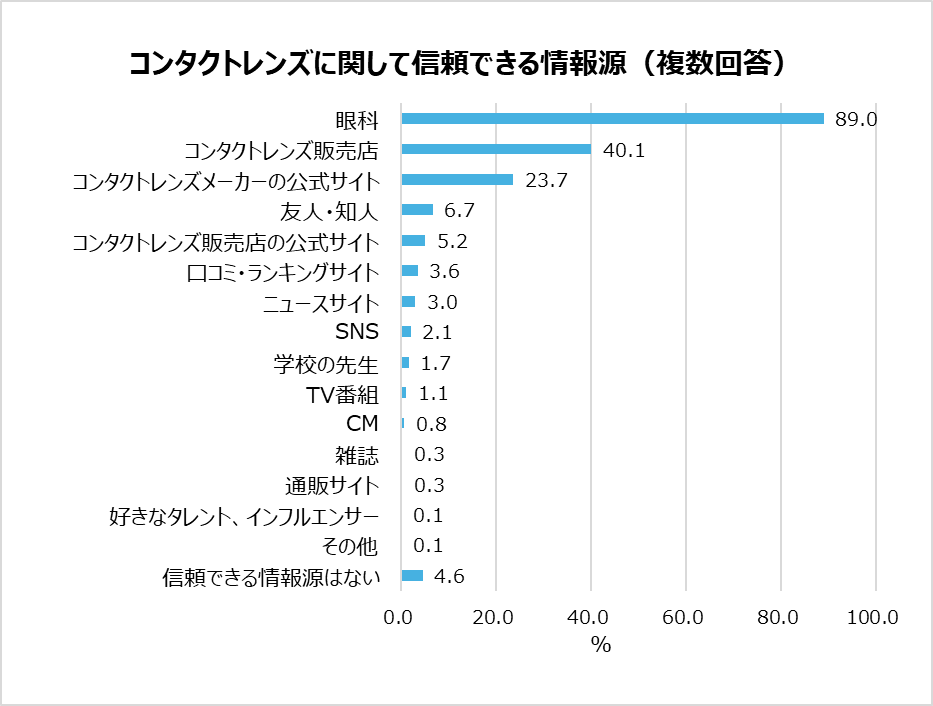 信頼できる情報源としては「眼科(89.0%)」「コンタクトレンズ販売店(40.1%)」「コンタクトレンズメーカーの公式サイト(23.7%)」が上位に挙がり、専門家・専門店は比較的信頼度が高いようです。