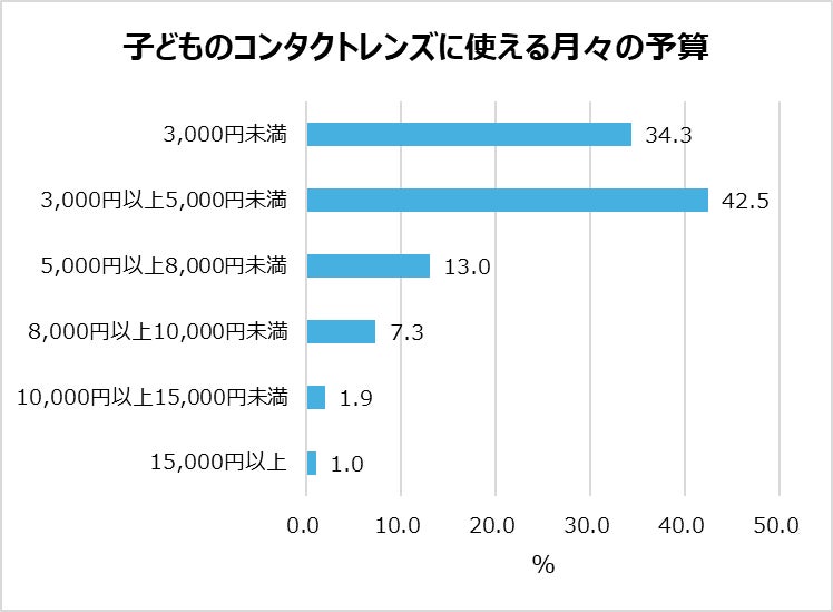 重視するポイントの2位は「価格(45.4%)」でした。そこで、ケア用品等も含め、子どものコンタクトレンズに使える月々の予算を聞いたところ、5,000円未満に7割以上の回答が集まりました。