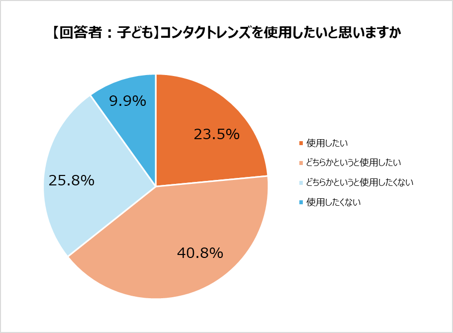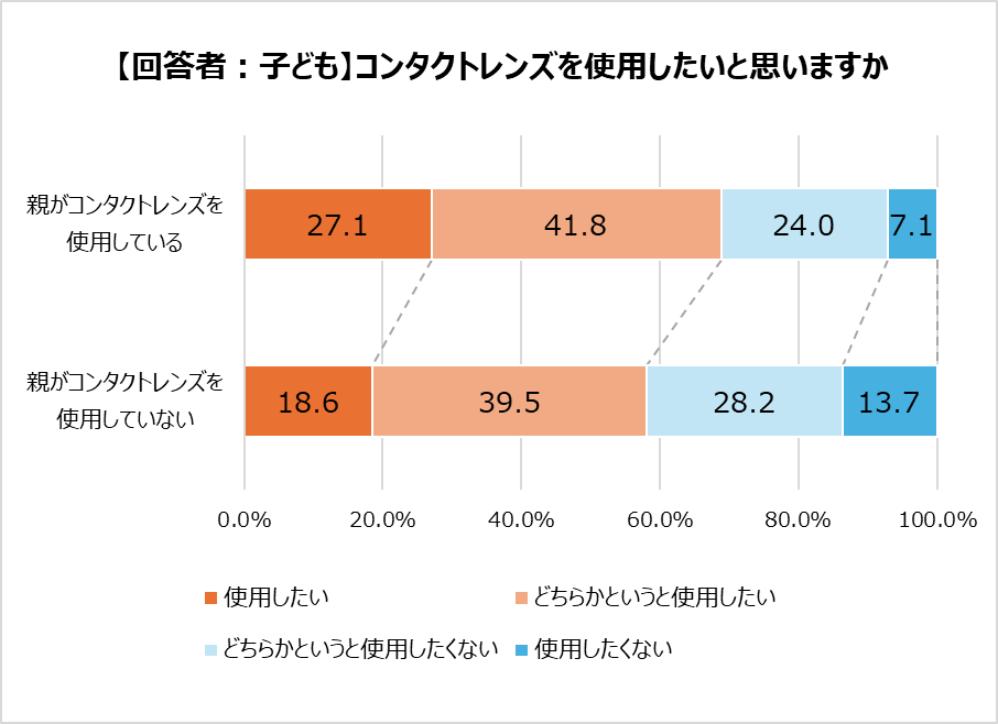 子どもに対しても、コンタクトレンズを使用したいと思うか聞きました(子どもは視力0.9以下/同席する親を介して回答)。その結果、6割以上が使用したいと回答。さらに、親がコンタクトレンズ使用者である子どもの方が、使用したい意向が高いことも分かりました。やはり、最も身近な存在である親の影響は受けやすいことがうかがえます。