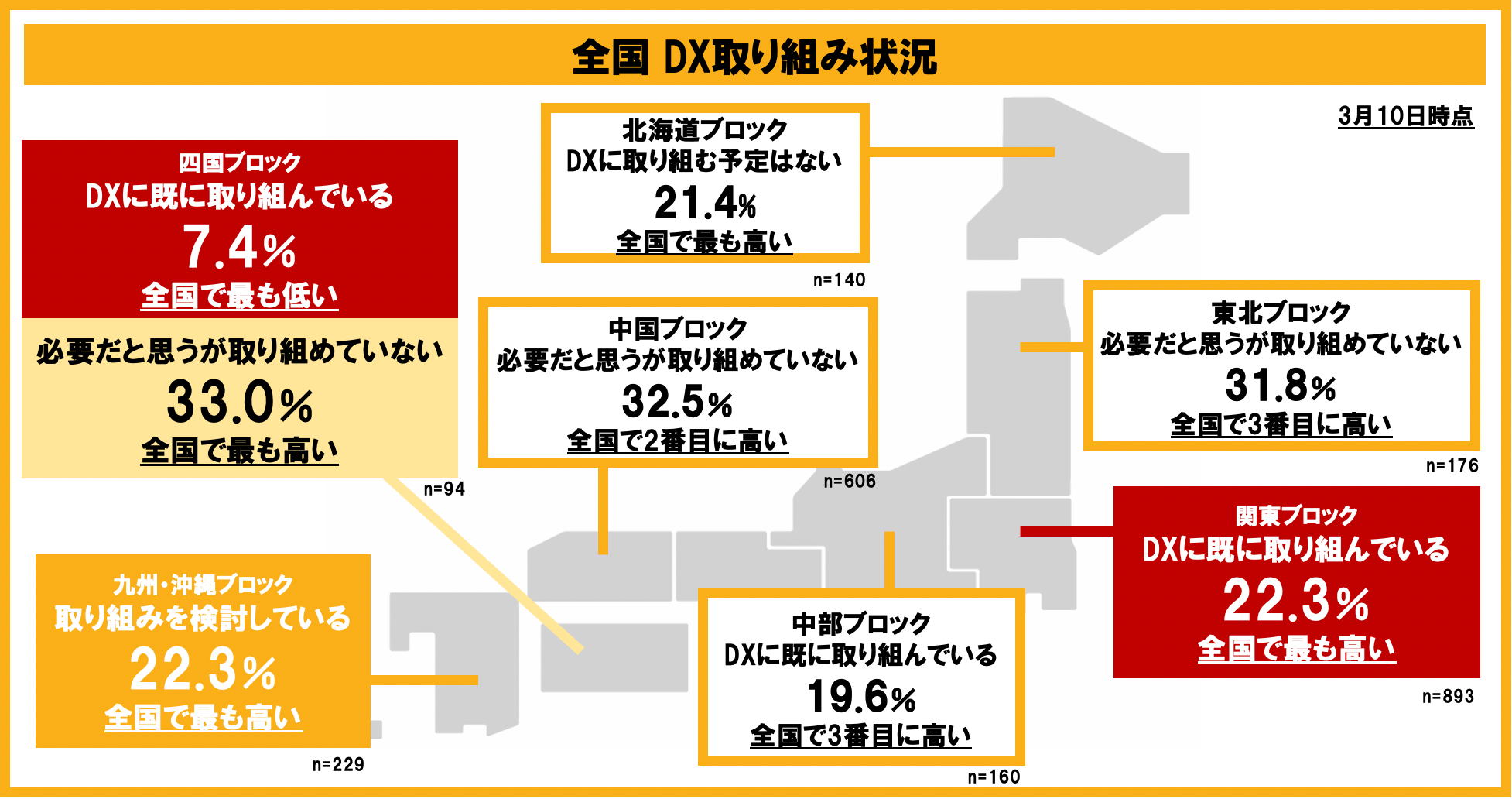一方で『DXに既に取り組んでいる』と回答した割合が最も低かったのは「四国地方」の企業で7.4%という結果になりました。しかしDXについて前向きな意見も多く、『必要だと思うが取り組めていない』と回答する割合が33.0%と、他エリアと比べると最も高く、潜在的な需要があることがわかりました。