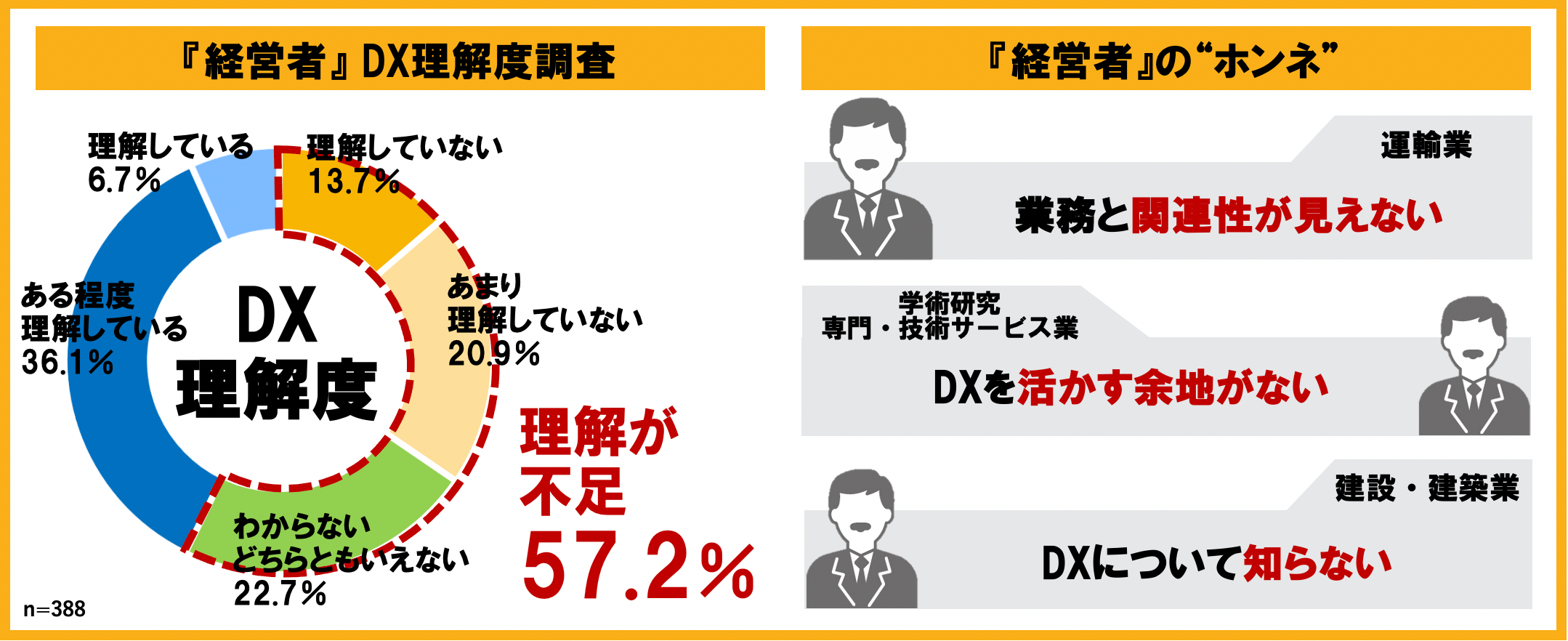 その結果、経営者の57.2%がDXについて『理解していない』『あまり理解していない』『わからない・どちらともいえない』と回答しており、また、『業務との関連性が見えない(運輸業)』や『DXを活かす余地がない(学術研究、専門・技術サービス業)』、『DXについて知らない(建設業/建築)』という声があがりました。業種問わず様々な中堅中小企業の経営者が、DXに対しての理解不足である現状やマイナスな印象を持っていることがうかがえました。