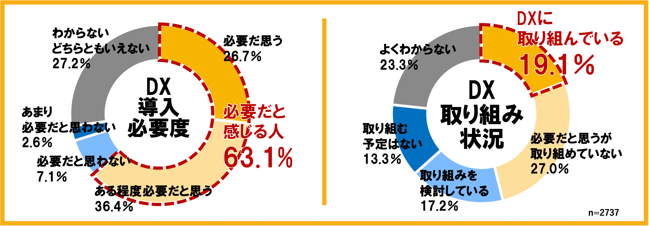 設問(左):あなたの会社・仕事に対して、「DX」への取り組みは、どの程度必要だと思いますか。