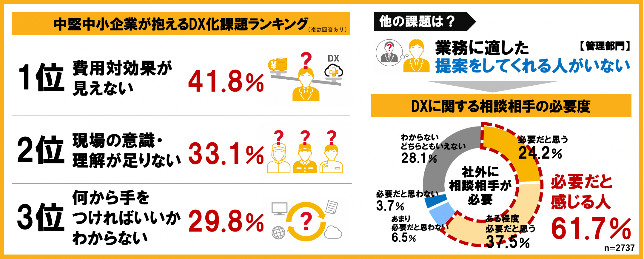 さらに、DXを進めるにあたり『社外の相談相手が必要か』という設問において、『社外に相談相手が必要』『ある程度必要』という回答が61.7%にも達しました。中堅中小企業の多くが人材不足であると言われている中で、専門的な知識を持った第三者の協力が求められていることが明らかになりました。