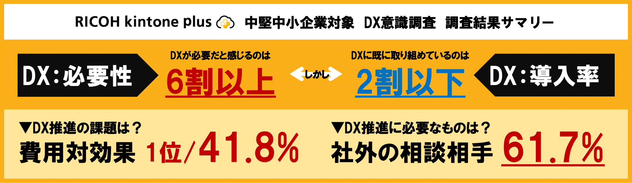 このような結果を受け、リコージャパンでは「RICOH kintone plus」などお客様の業種業務にあったソリューション提案を強化し、全国に拠点があり、DXについて気軽にご相談いただける営業スタッフが常駐している環境や地域密着での伴走型のサービスで、中堅中小企業のDXを推進してまいります。