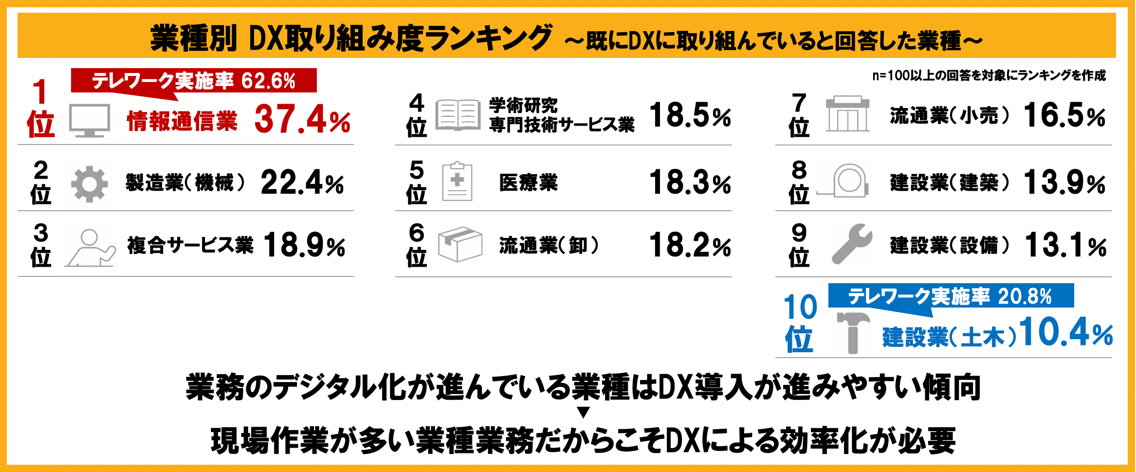 【調査結果詳細④】業界別のDXへの取り組みの1位は「情報通信業」。「建設業」は最も取り組みが低い結果に。
