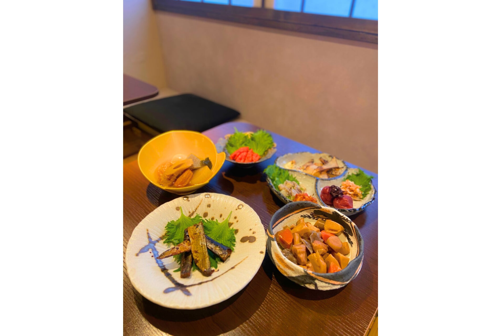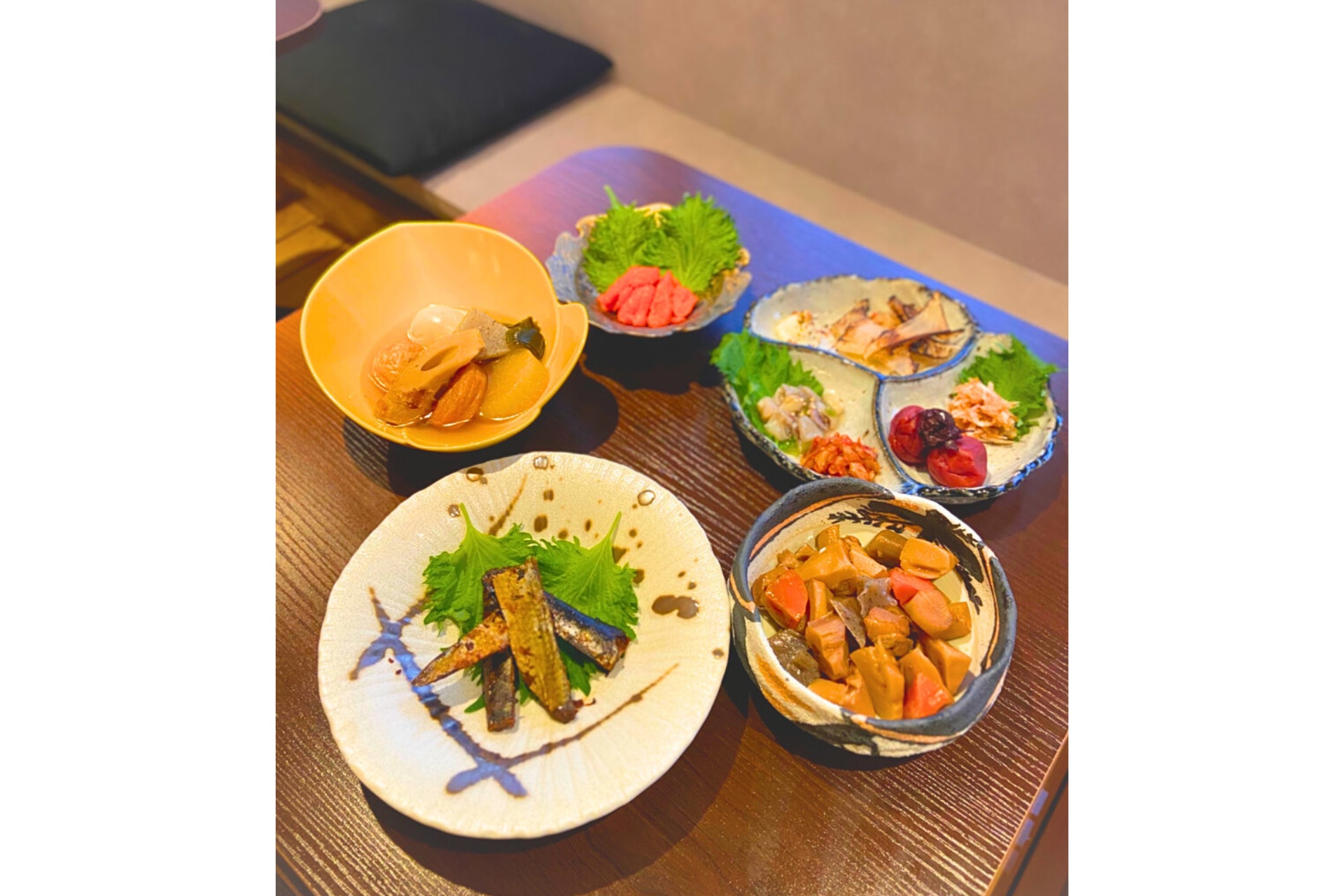 京漬物盛り合わせ、明太子、温泉卵、だし巻き玉子、京風肉じゃが、おでん盛りなど