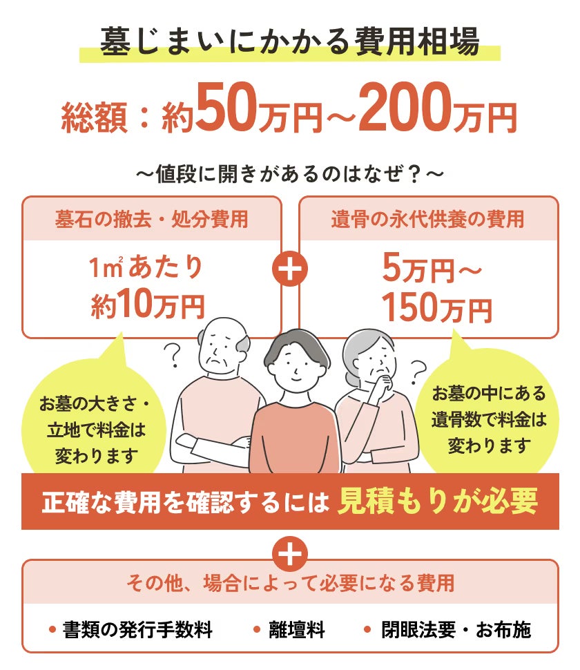 特に「墓じまい」の場合、費用相場は50万~200万円と高額で、「想像以上にお金がかかる」と感じて悩まれる方も少なくありません。