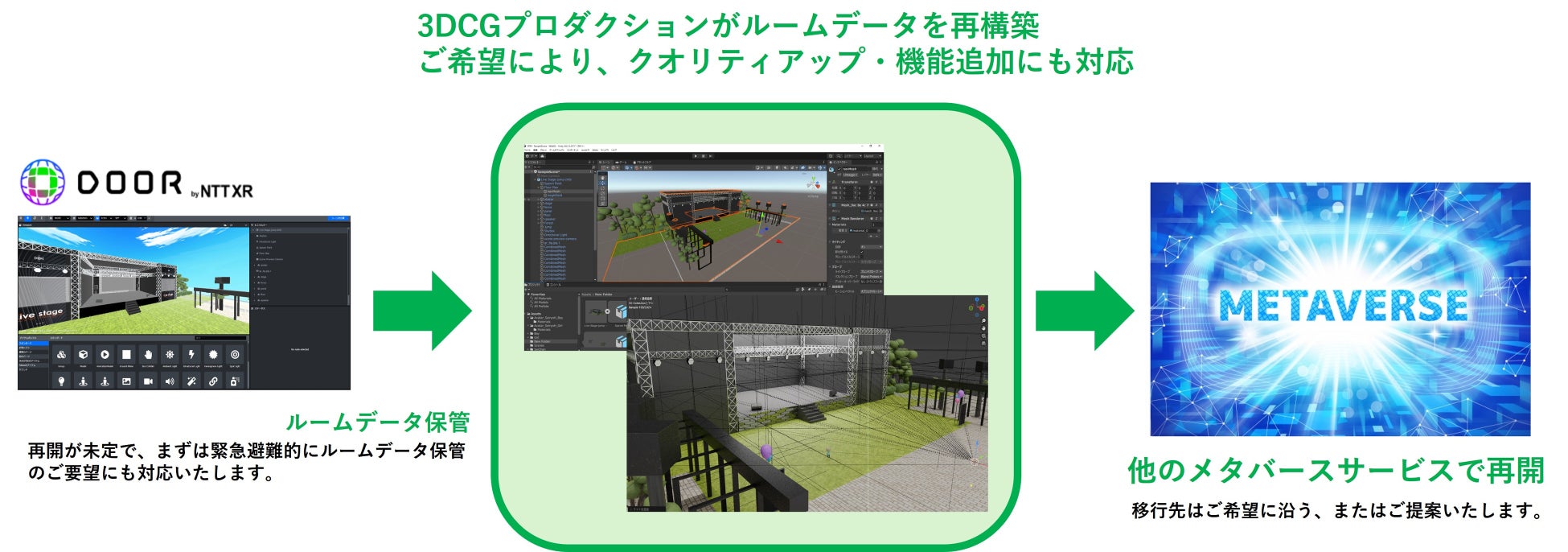3月末にサービス終了となるメタバースNTT「DOOR」から早急にルームデータを保管・再構築し、他メタバースサービスへの移行を低コスト・短期間で緊急支援いたします(移行費用:15万~ 期間:最短5日~)