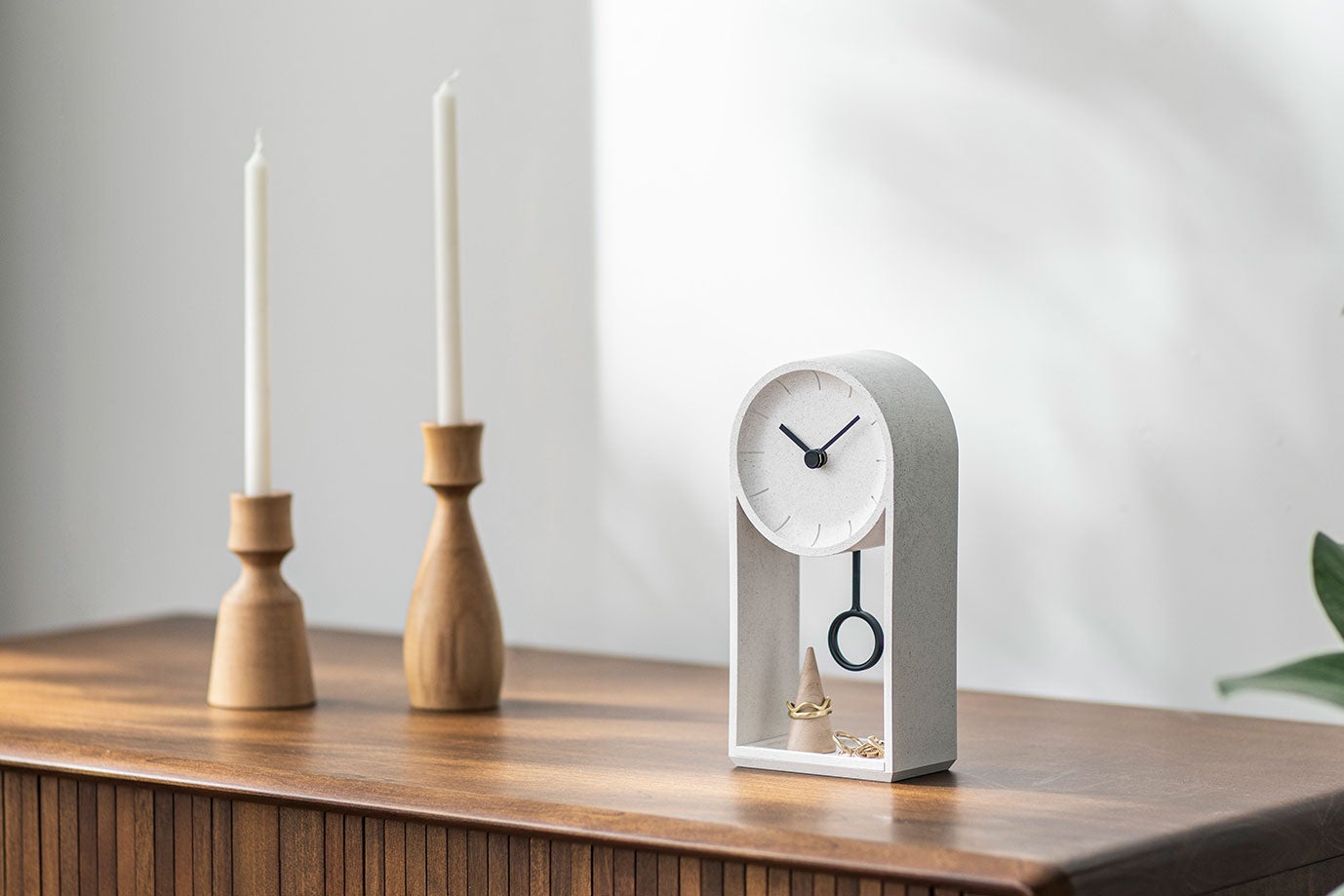 時計として使用しながら、トレイにはアクセサリーやオブジェなどを置けるためアートスペースとして暮らしを彩ります。振り子のモニュメントにお気に入りのピアスなどを掛けて飾ることもできます。壁掛け時計としても使用できる2wayです。