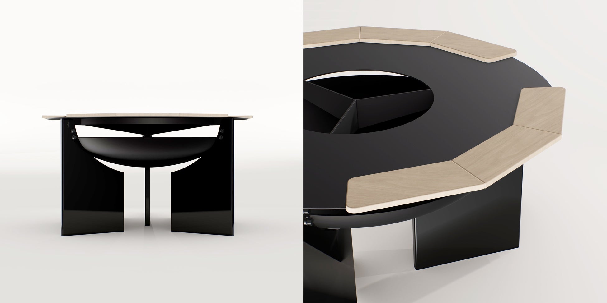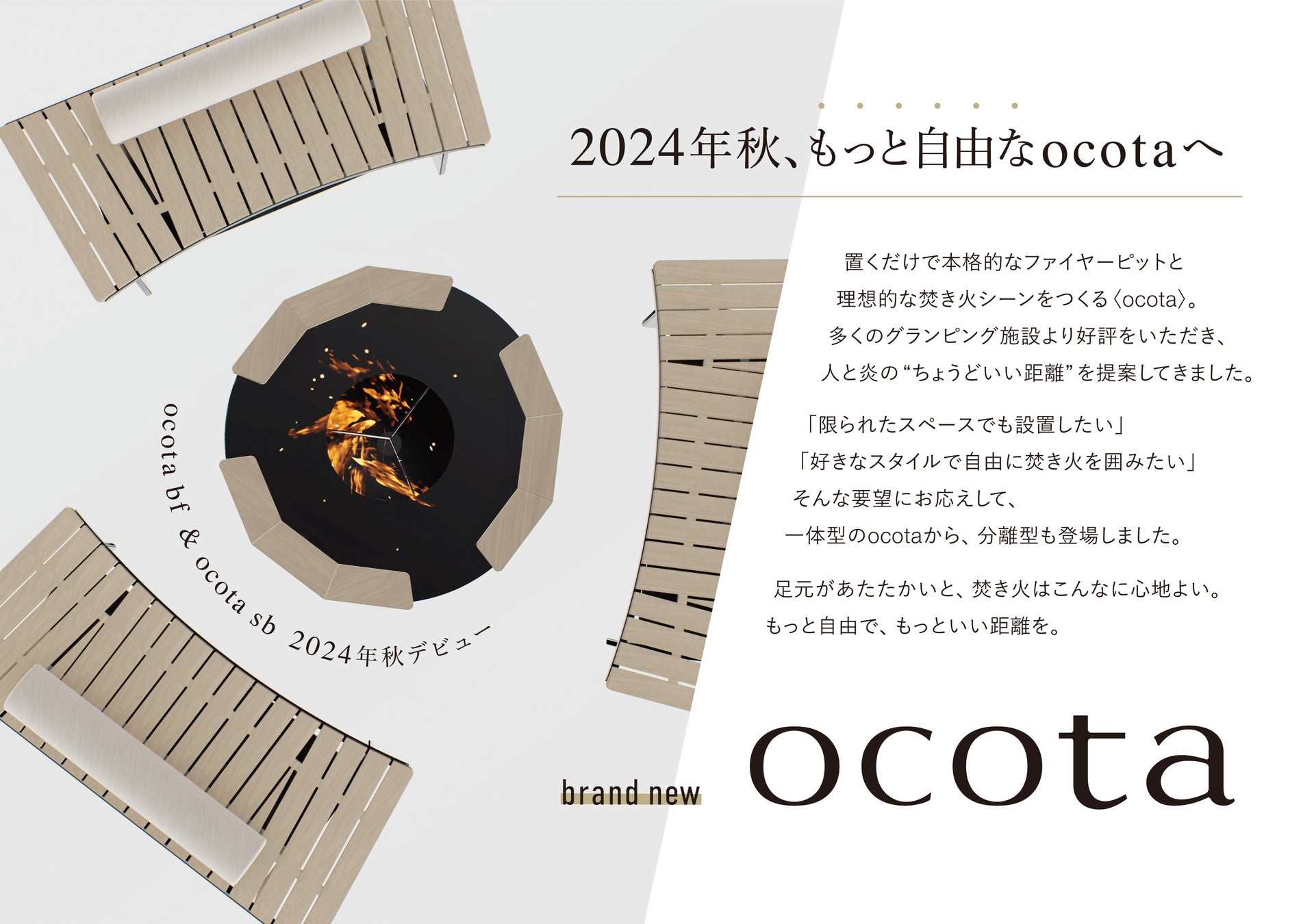 『2023年に〈ocota〉ブランドがデビューしました。第一弾はベンチ&テーブル一体型の「ocota fp」で、置くだけで本格的なファイヤーピットをつくることができるものですが、施設などに導入いただいた方から「限られたスペースでも設置したい」「好きなスタイルで自由に焚き火を囲みたい」という要望が上がり、一体型のocotaから、このたび分離型を発売することになりました。焚火台とベンチを別でレイアウトすることができるため、設置場所の自由度がアップするのはもちろん、専用ベンチだけでなく、お気に入りの椅子を使うこともできます。