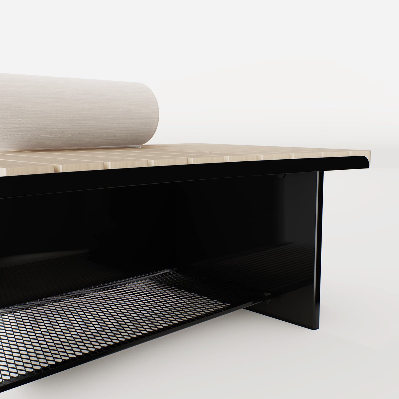 座面には質感のいいオークの板を使用。板が取り外し式なので、夏季など長期間使用しないときや、雨天時は、板を外して保管することも可能です。座面下のメッシュ棚は、薪などの収納にも便利です。