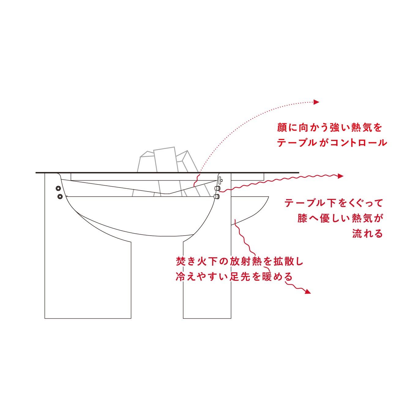 〈ocota〉シリーズは、焚き火台の上に設置したドーナツ状のアイアンテーブルがあることで、顔に向かう強い熱気をコントロール。さらに、焚き火下は放射熱が広がる形状なので、冷えやすい足元をじんわりと暖めてくれます。テーブルがあるおかげで、膝あたりへ優しい熱気が流れる構造なので、顔が火照りにくく、逆に膝から足元が暖かくなる独自構造を採用しています。