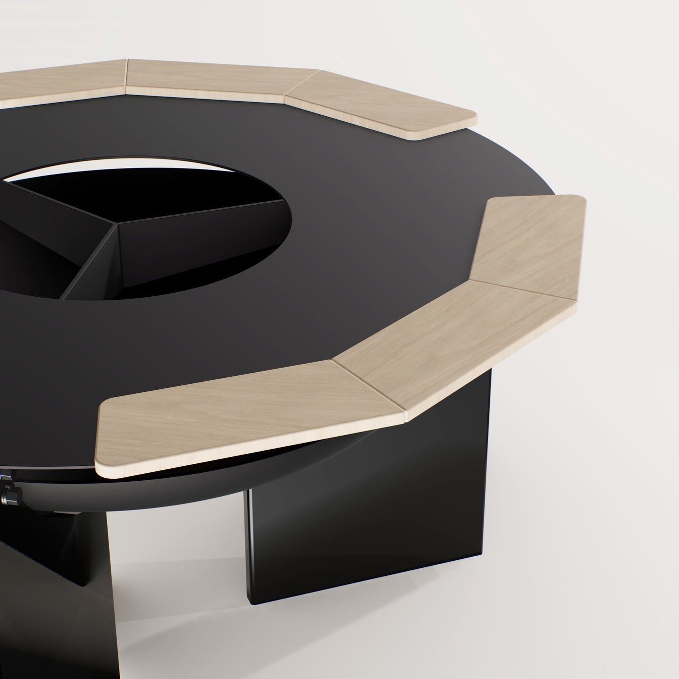 長時間焚き火にあたっていると、顔ばかり熱くて火照る割に足先は寒いまま…という状態になりがちですが、〈ocota〉はドーナツ状のテーブルが焚き火の熱気をコントロールするため顔が熱くなりにくく、逆に冷えやすい足先側に熱気が溜まる独自構造を採用。顔が火照るのを抑えつつ、膝下〜足元が暖かくなりやすい、炎と人の理想的な距離感を考えた焚き火台です。