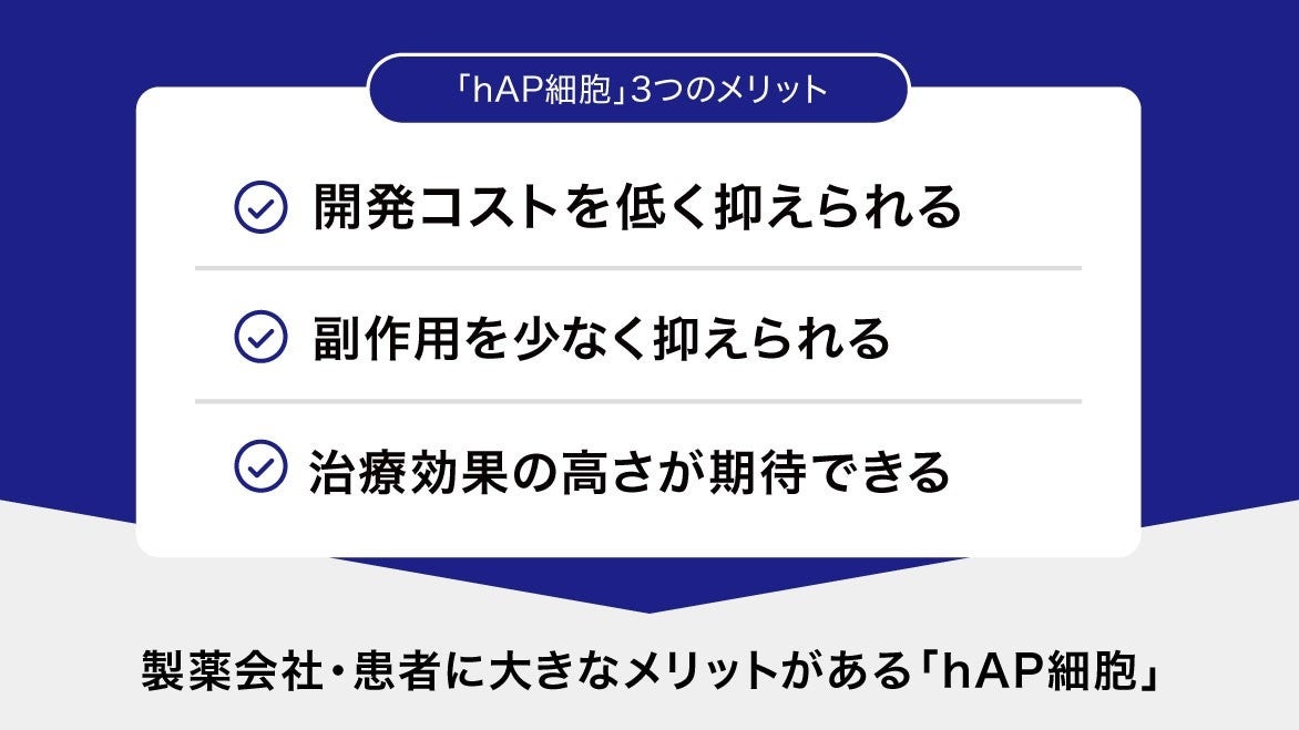 「hAP細胞」は比較的低コストで製剤化可能で、副作用も少なく治療効果も高いことが特徴です。また、上場企業などと産官学の連携で共同開発していること、さらに「hAP細胞」の基となった特許の独占的実施許諾権を保有していることも強みとなります。