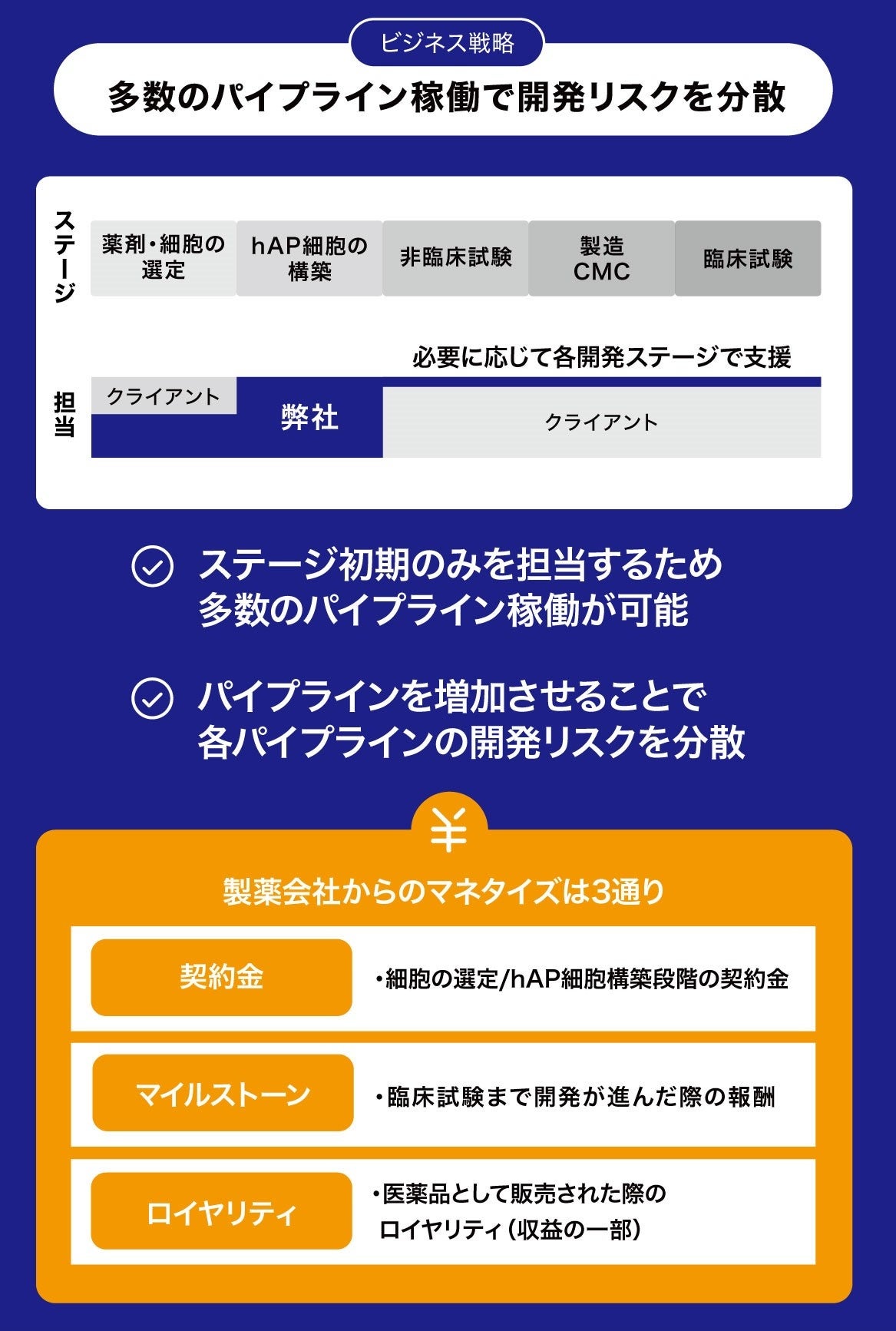 「hAP細胞」は適当な化合物と適当な細胞を組み合わせることで、様々な疾患に対する開発が可能です。弊社は、「hAP細胞」構築を創薬プラットフォームとして国内外の製薬会社へ提供し、開発ステージに応じた収益化を計画しています。