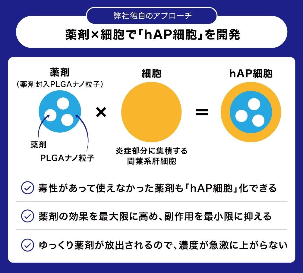 弊社は、この細胞を用いたDDS技術を利用して、「hAP細胞」を開発しました。「hAP細胞」は、化合物を封入したPLGAナノ粒子(縫合糸などに使用される安全性が確認されたポリマー粒子)を細胞(炎症部に集積する性質のあるもの)に取り込ませて調製されます。これまで抗体などタンパクをDDSとして使用した事例はありますが、細胞に使用した例は弊社が初めてだと考えています(弊社調べ)。