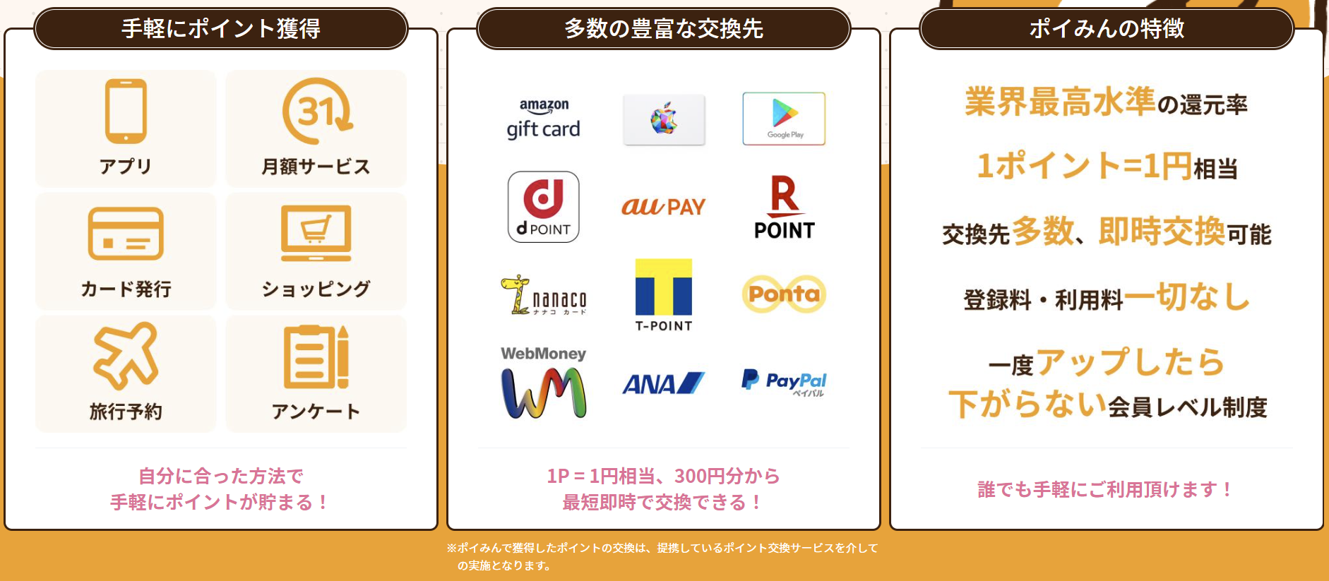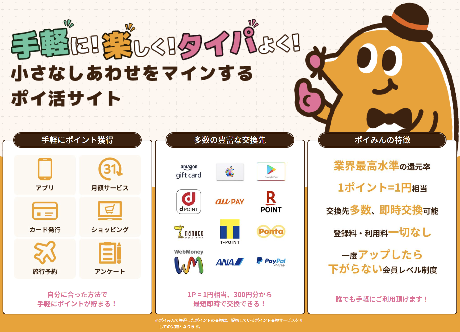 ポイントサイト「ポイみん」は、様々なサービスの利用登録やネットでのお買い物の際に経由するだけで、ショップのポイントだけでなく、現金やギフト券、各種電子マネーに交換が可能な「ポイみんポイント」が獲得できるインターネットメディアです。