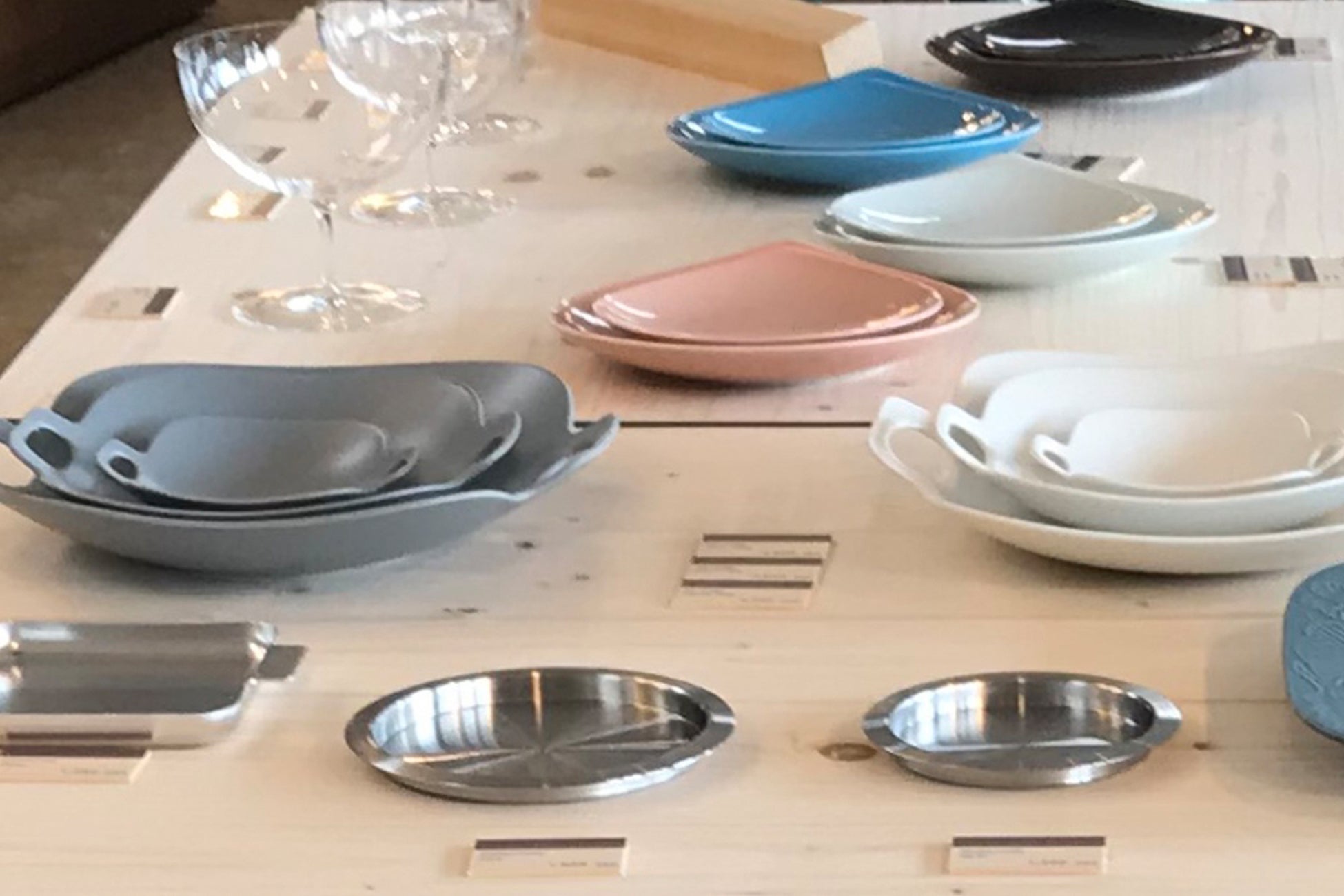 yumiko iihoshi porcelainの有田焼シリーズやグラス、トレイなども展示販売。ここでしか購入できない有田限定色などのレアアイテムもあります。