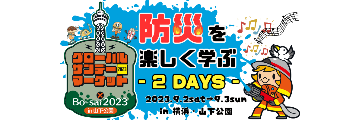 関東大震災から100年となる本年、防災減災を発信し、ゼロカーボン・ゼロウェイストの取り組みを取り入れた新しい国際文化交流事業として、「GLOBAL SUNDAY MARKET×Bo-sai2023」を開催致します。会場全体を防災発信エリア、ステージエリア、フードエリアの 3つのエリアで国際文化交流と防災発信を行います。そして、ゼロカーボン・ゼロウェイストに取り組むことでやさしい循環経済を促す国際都市横浜としての魅力を、国籍や人種の垣根を超え、市民の皆様が楽しみながら体験できる事業となります。