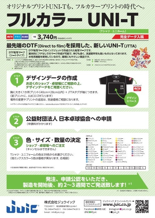 DTF(Direct to film)を採用した、新しいオリジナル・Tシャツ型卓球ユニホームのご提案です。
