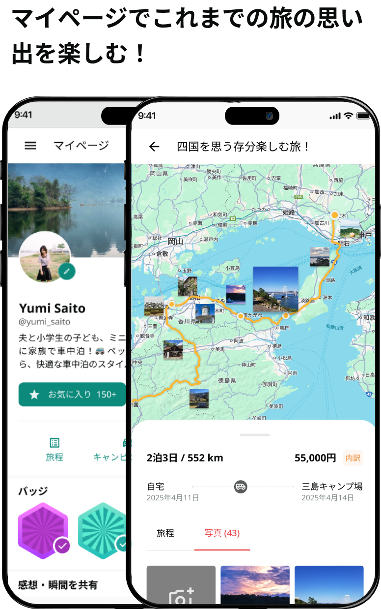 キャンピングカーの情報やキャンプの記録・お気に入りの場所の情報などを保存。旅の思い出をアニメーションで振り返り・写真や旅程履歴をSNSに簡単投稿!デジタルステッカーの作成・交換もできます。