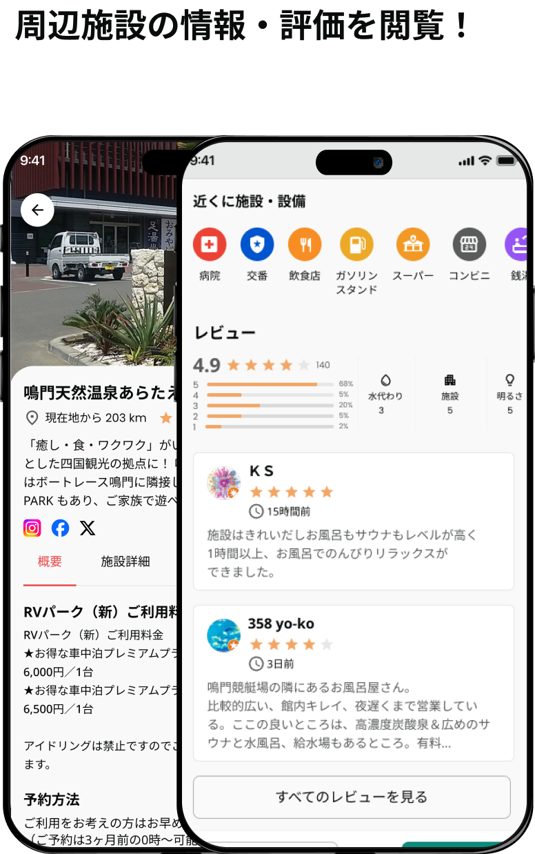 RVパークや施設などを評価。他のユーザーの参考になる情報を提供、確認できます。