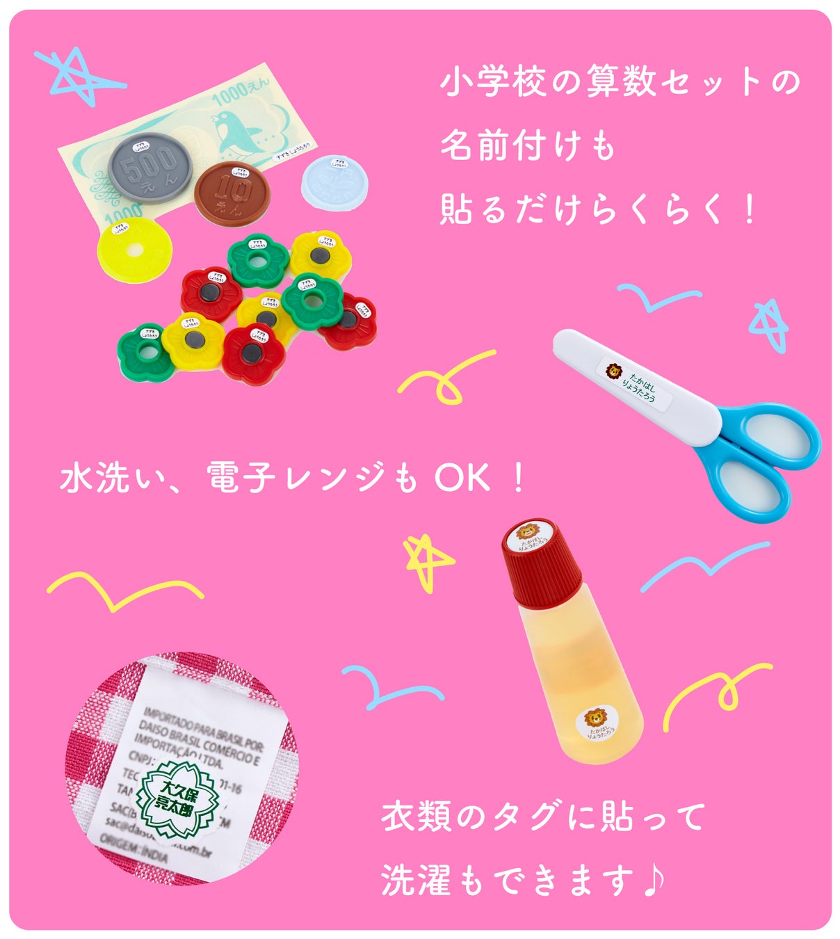 プラスチックとの相性も良く、文房具に最適で貼るだけなのに長持ちするお名前シールです。