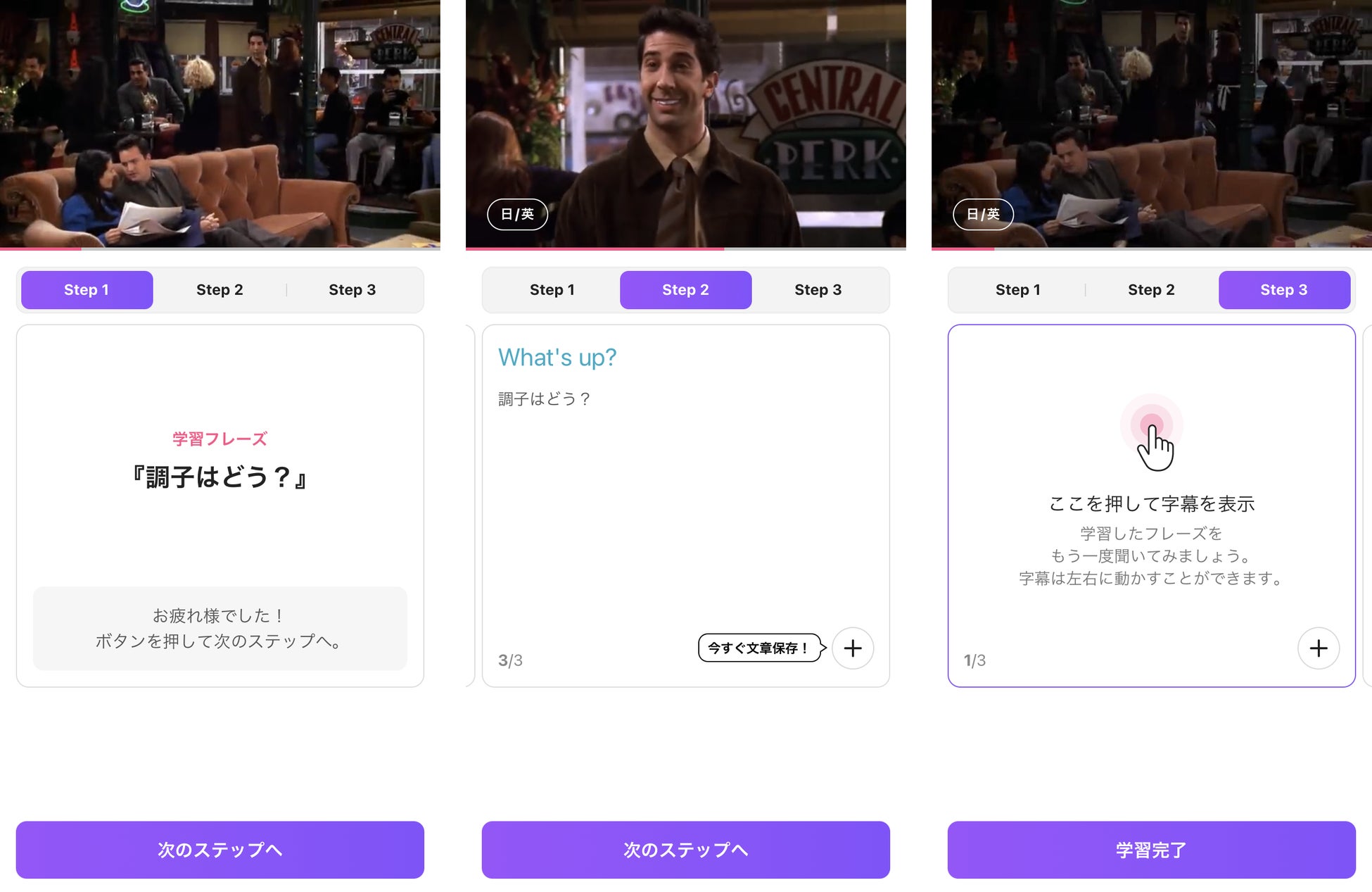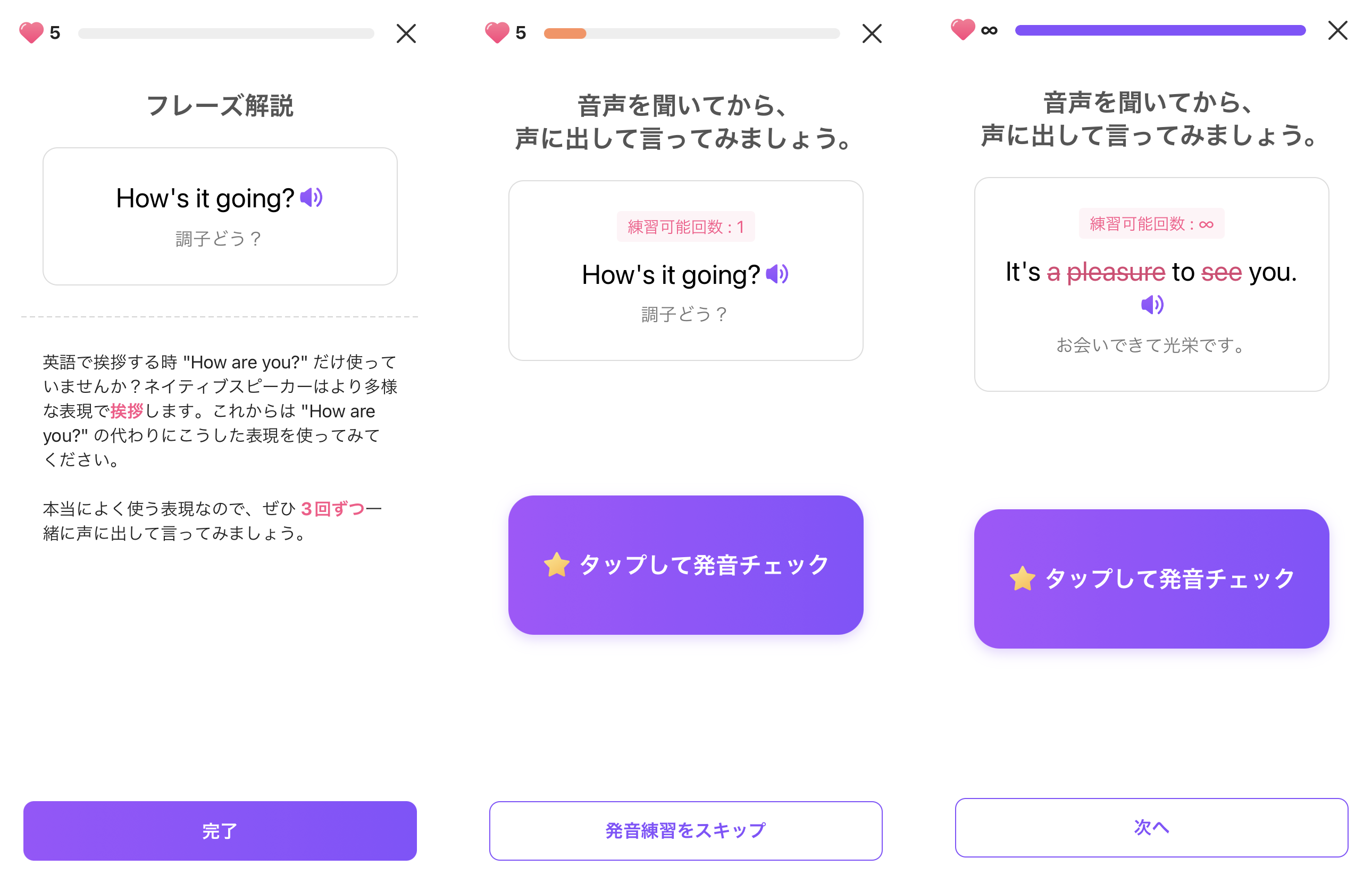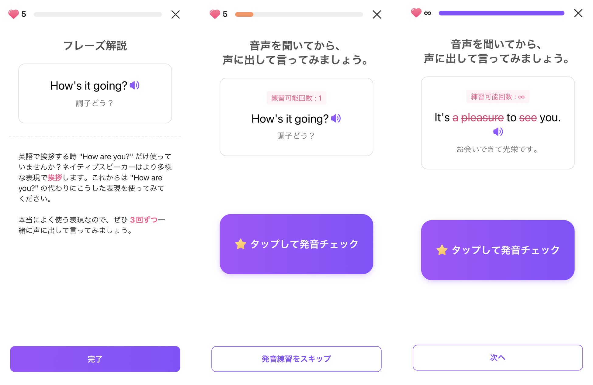 「スピーク」段階では、ネイティブの発音でメイン表現を聞き、表現にまつわるワンポイントレッスンを確認し、発音練習をすることができる。高い精度を持つ自動判定のAIが、ユーザーの音声を認識し、英語の発音を分析・評価した上、間違えた箇所は赤線で明記されるため、意識しながら繰り返し練習することで発音の精度を高められる。
