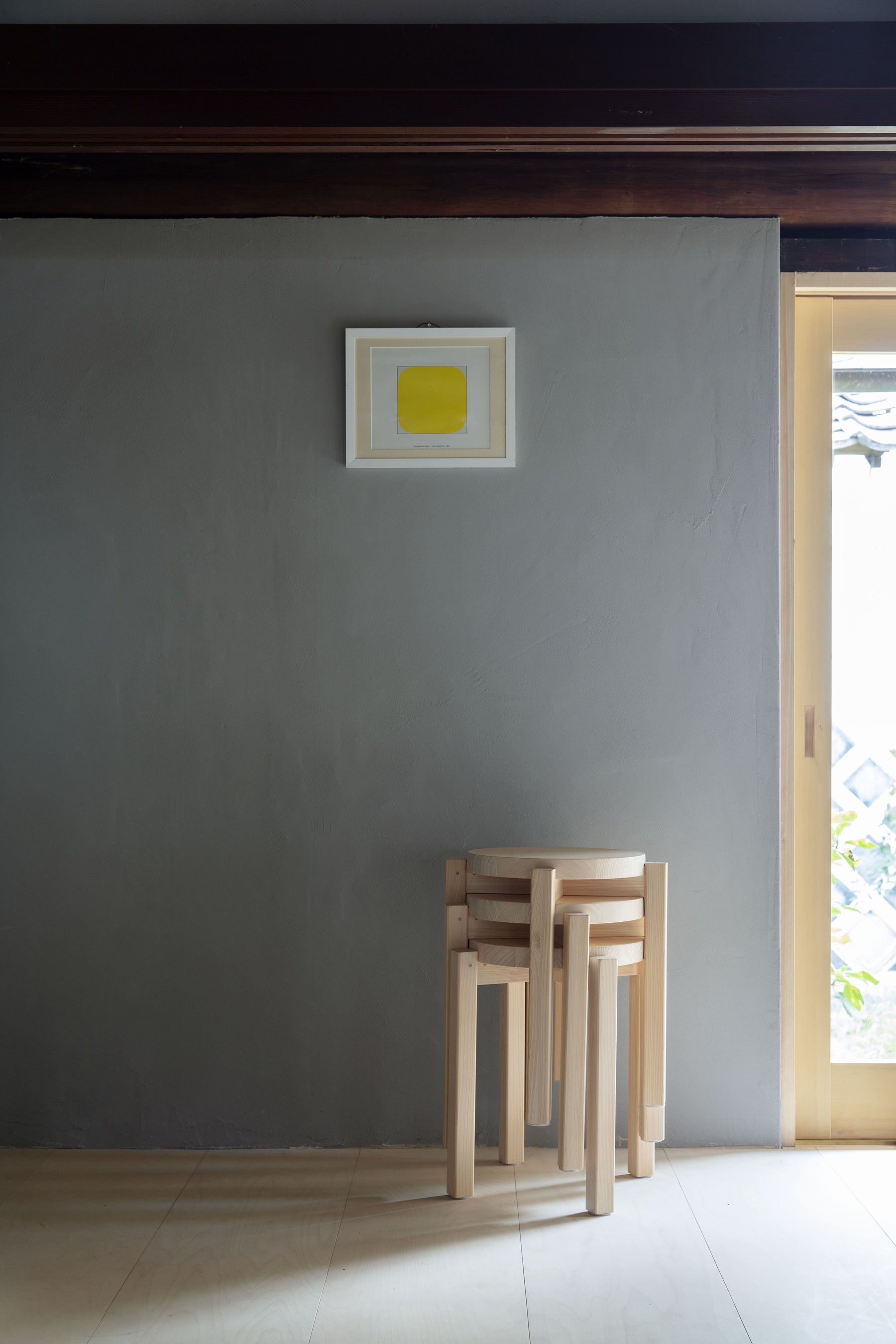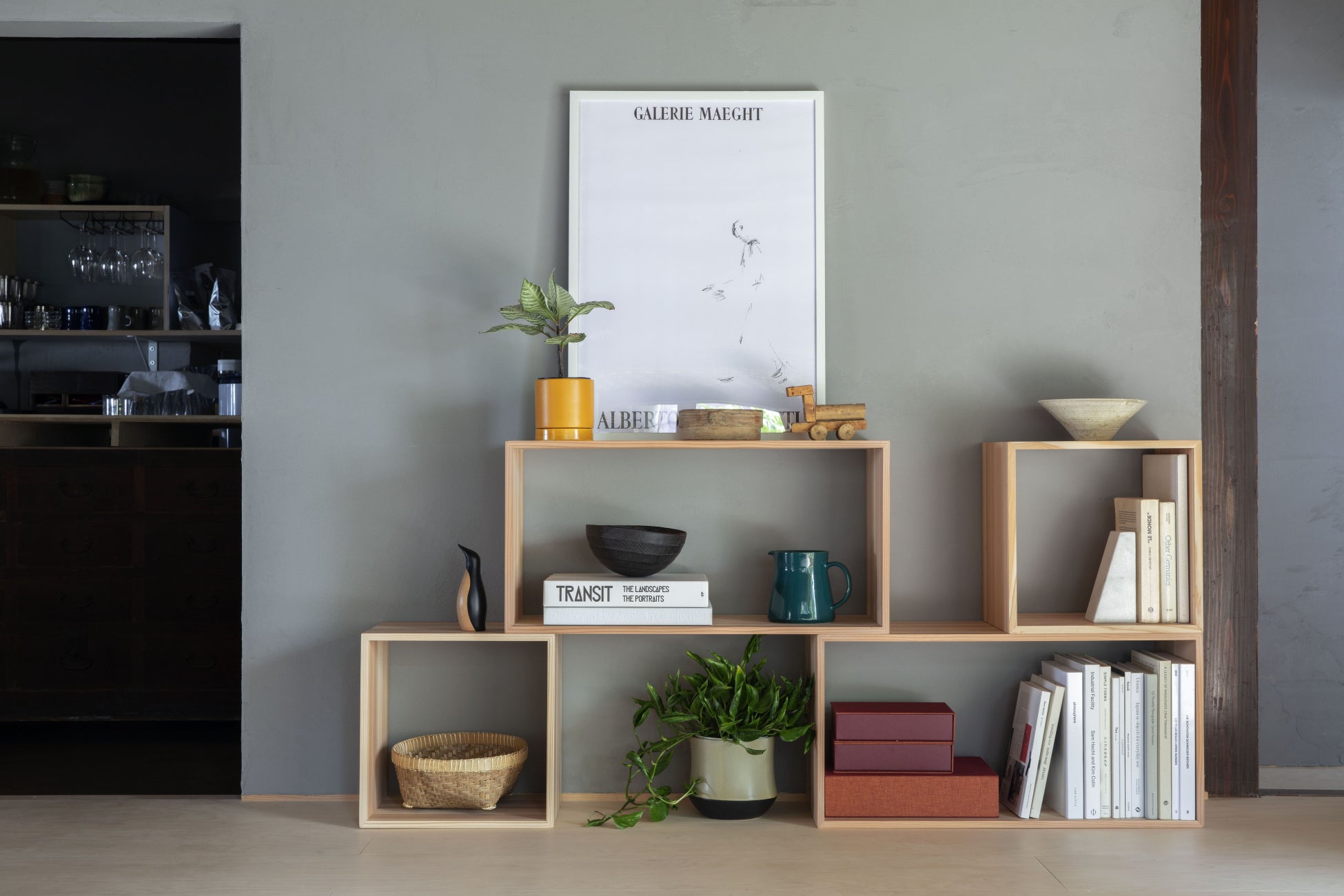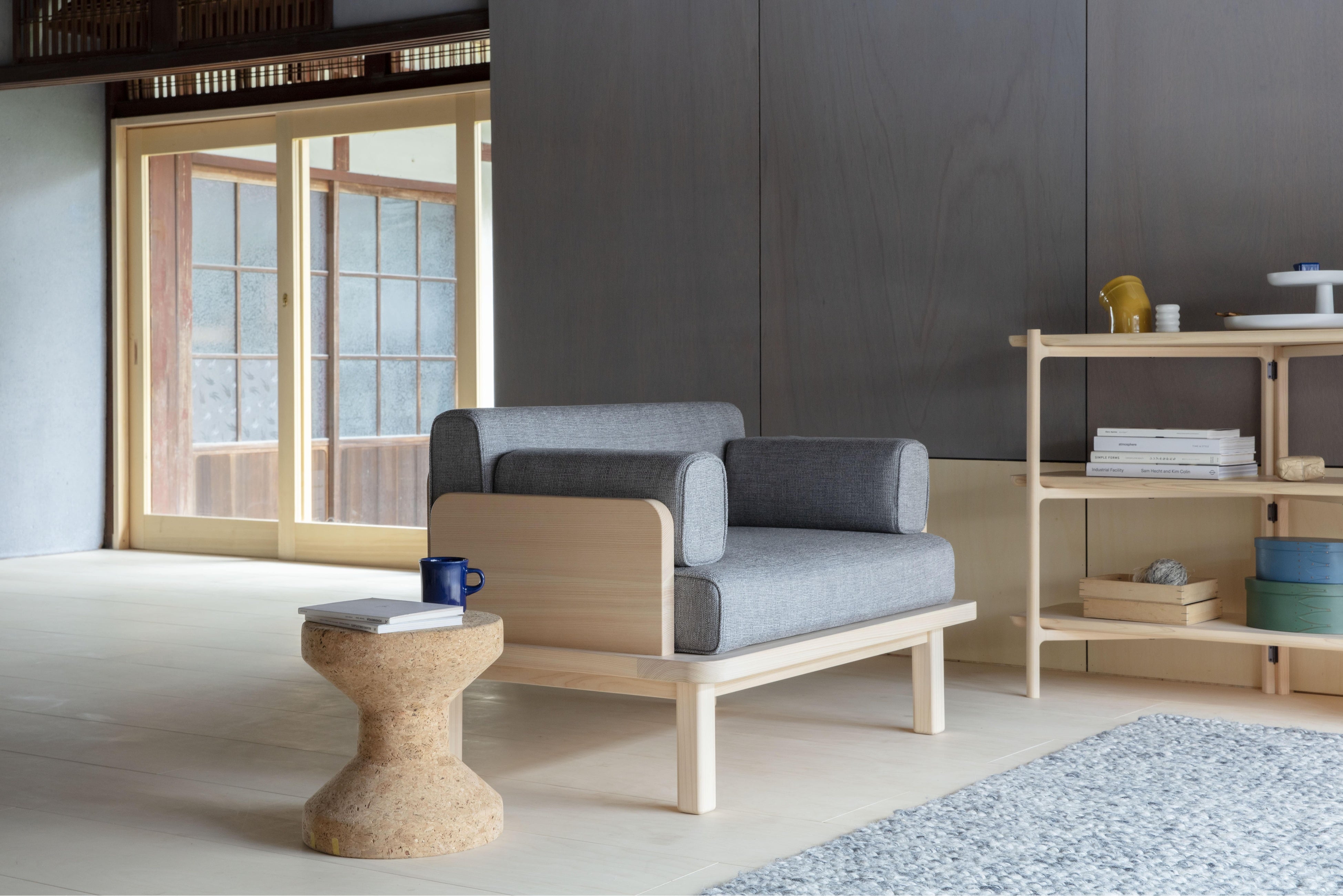 ヒノキのブロックソファ、ヒノキのTVボード、ヒノキのラウンドスツール、ヒノキの折りたたみテーブル、ヒノキの飾り棚、ヒノキのコンパクトキッチン、スギのストライプボックス