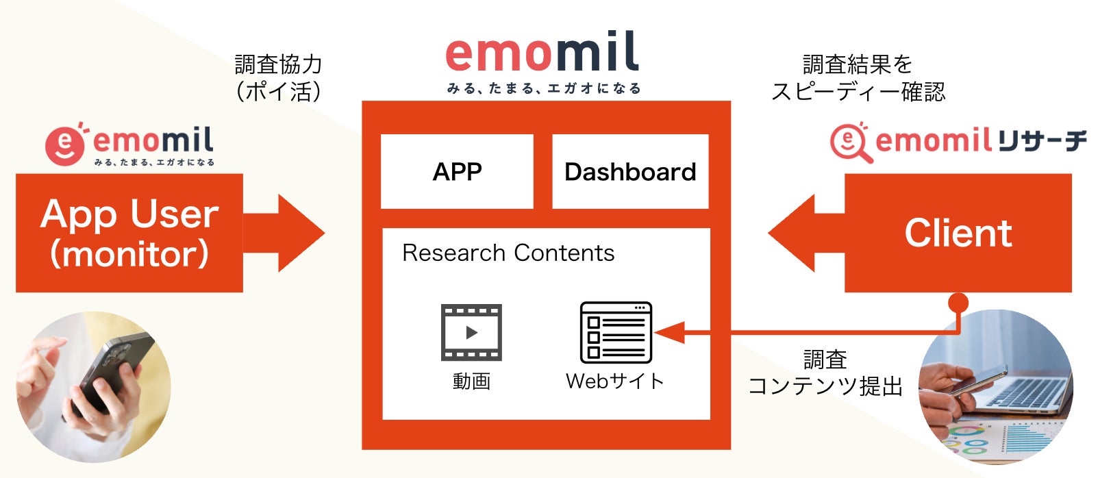 クライアント企業は、調査するコンテンツをエモミルリサーチから出稿することで、コンテンツはポイ活アプリエモミルに調査案件として表示・視聴され、アプリを利用するユーザーを対象にデータ収集を行うことが可能です。調査によって収集されたユーザーの視聴データはシステムを通じて分析が行われ、エモミルリサーチが提供するダッシュボードを用いることで、クライアント企業の担当者自らより詳細な分析を行うことができます。