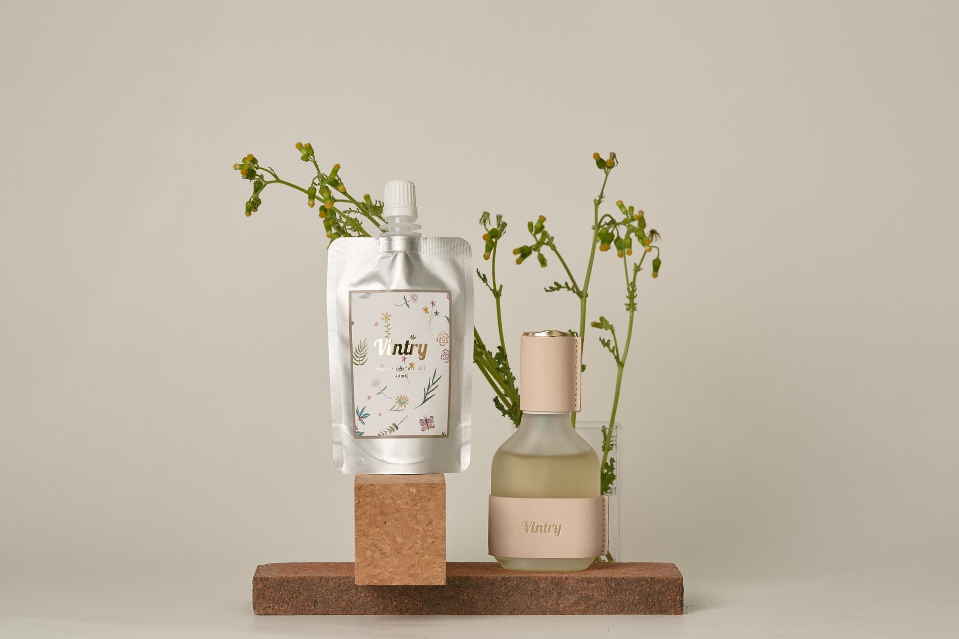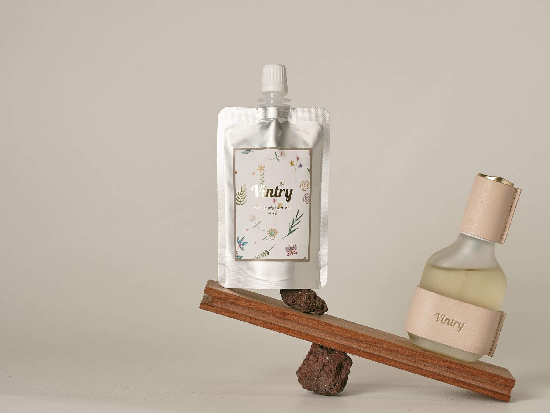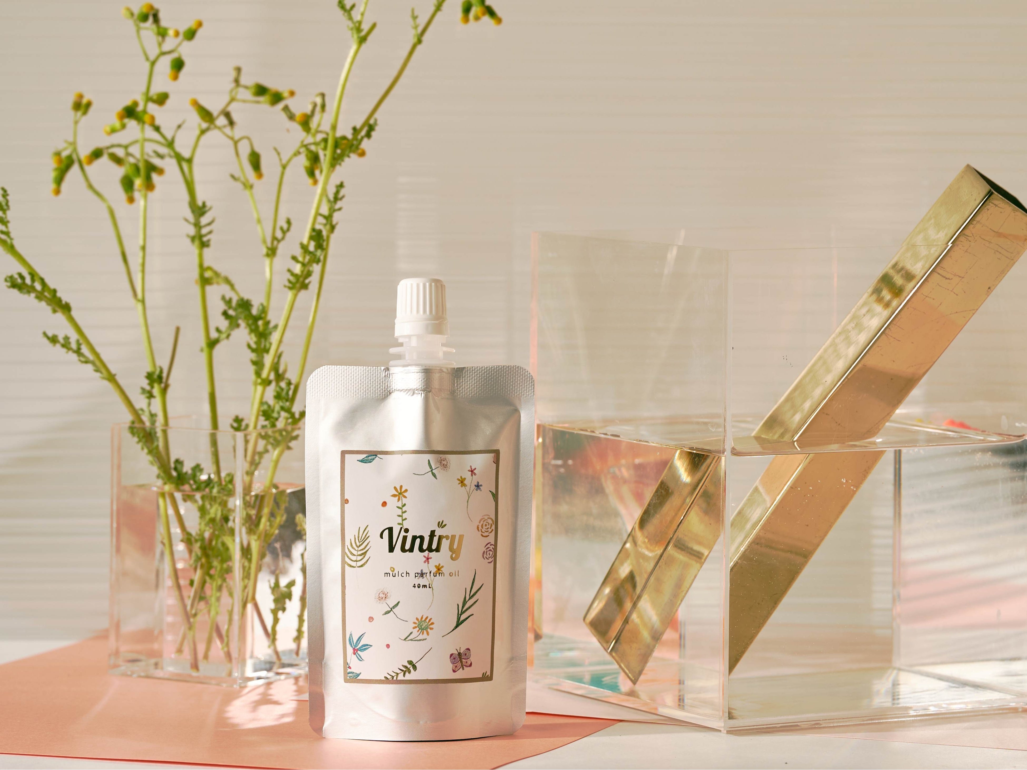 Vintryでは環境や身体に配慮したもの作りを目指しており、マルチパルファムオイル本体も環境への配慮、長く使い続けることを想定としたデザイン設計が行われています。繰り返しリサイクルができるガラス瓶をボディとし、使い続けることで生まれる経年変化を楽しめるヌメ革製のスリーブを本体に付けています。使い終えたら中身はリフィルで補充し、容器は繰り返し使い続ける、自身のケアを時間と共に楽しみ、積み重ねていくライフスタイルを提案します。