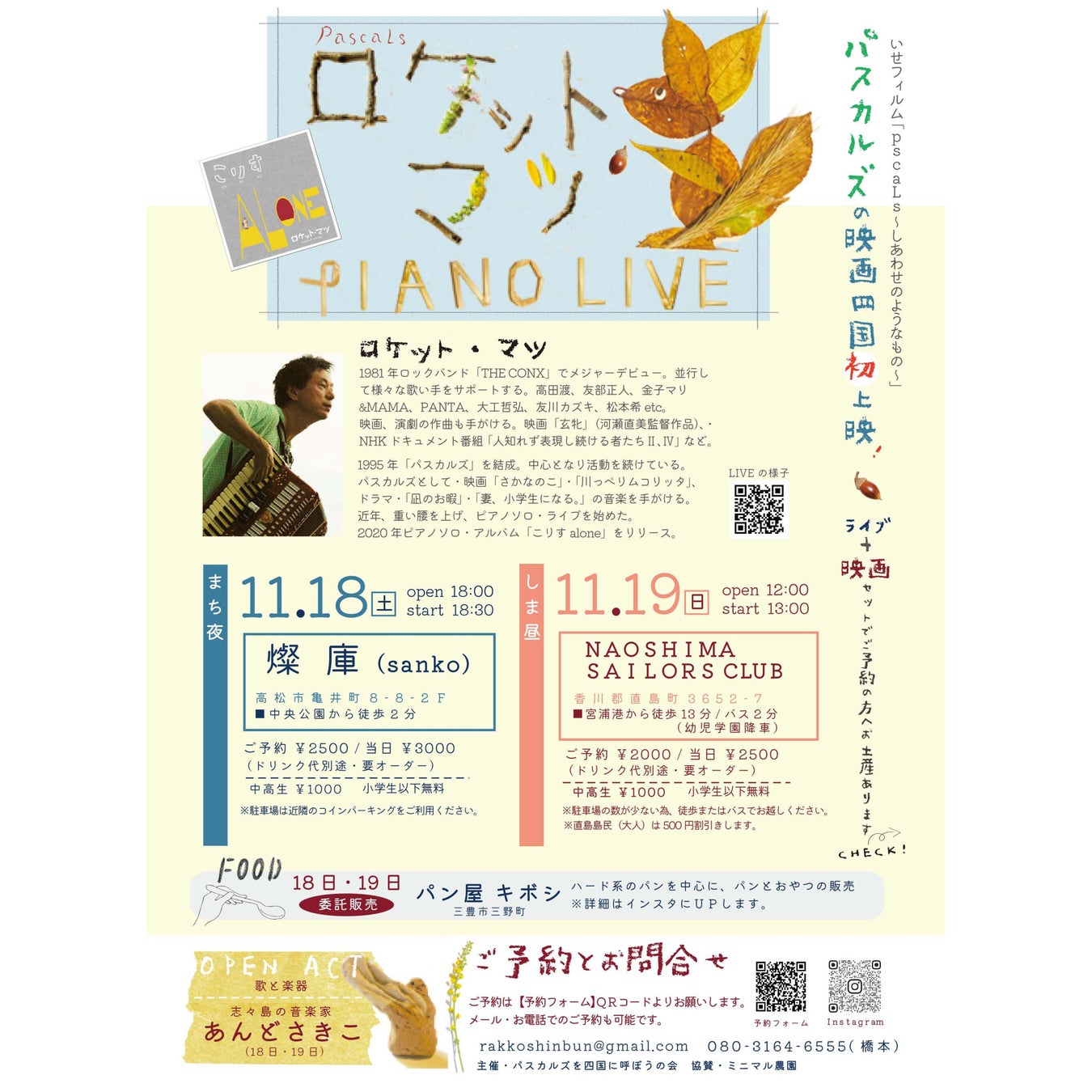 結成28年のアコースティックオーケストラバンド、PASCALSのバンドマスターを務めるロケット・マツ氏が直島に初来島します。直島でのライブは、ピアノとピアニカを演奏してくださる予定です。四国初上映となる同バンドのドキュメンタリー映画の高松上映翌日に開催(こちらも注目!)。