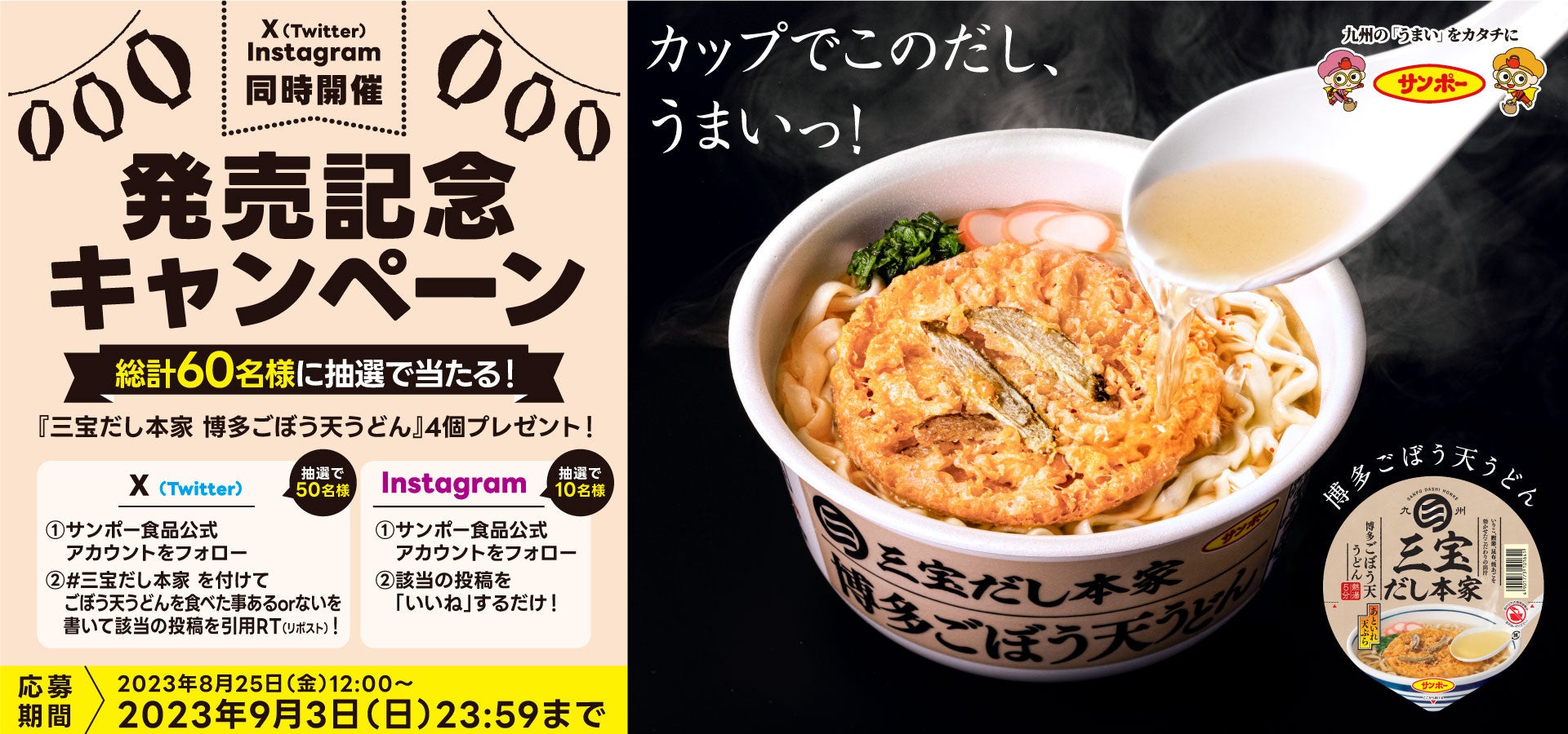 「三宝だし本家 博多ごぼう天うどん」の発売を記念してX(Twitter)と Instagram にて、キャンペーンを同時開催いたします。