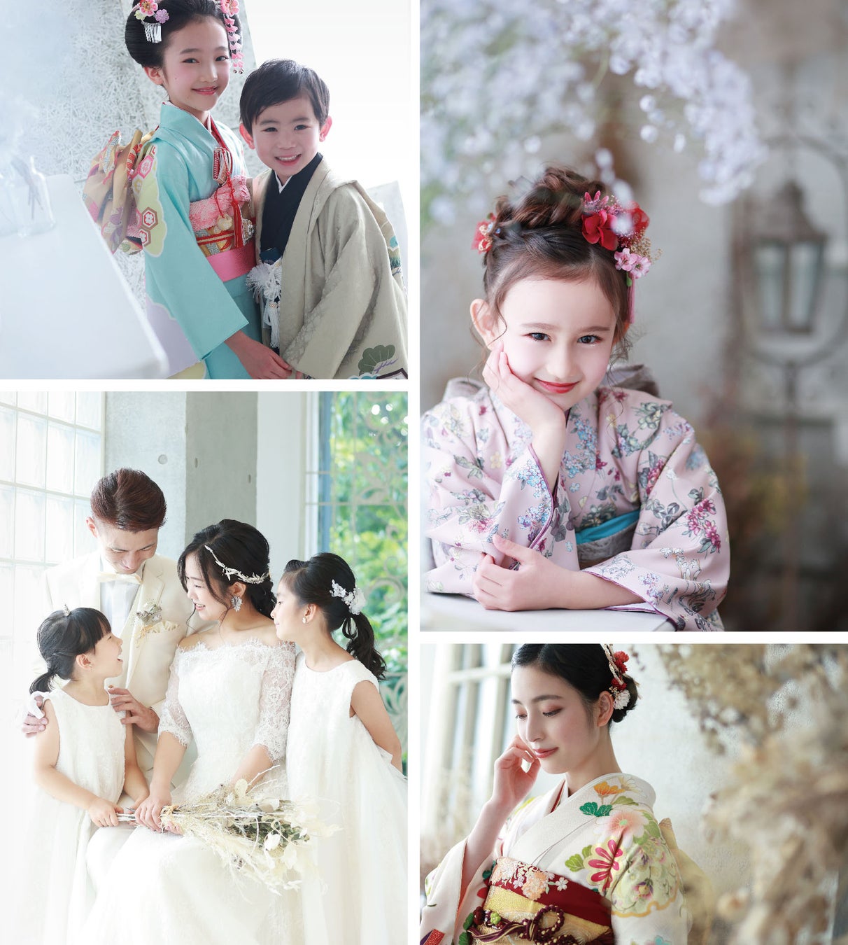 また、フォトスタジオでは珍しい充実した衣裳の品ぞろえと、着付けやヘアメイクを行うスタジオ専属の美容スタッフが在籍しております。今後も顧客満足度を高めるため、撮影技術力、ヘアメイク・着付けの技術の研鑽を重ね、圧倒的な経験値と技術力で「撮影」「美容」「衣裳」のトータルプロデュースを提供していきます。