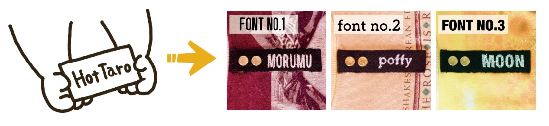 ウェアの仕立てが決まったら、最後に名入れをして完成。HOT DOG STUDIOおすすめFONT NO.1〜NO.3の中からお選びいただけます。CRAFT SERVICE専用のHOT DOG STUDIOオリジナルデザインタグにワンちゃんの名前を刺繍していきます!