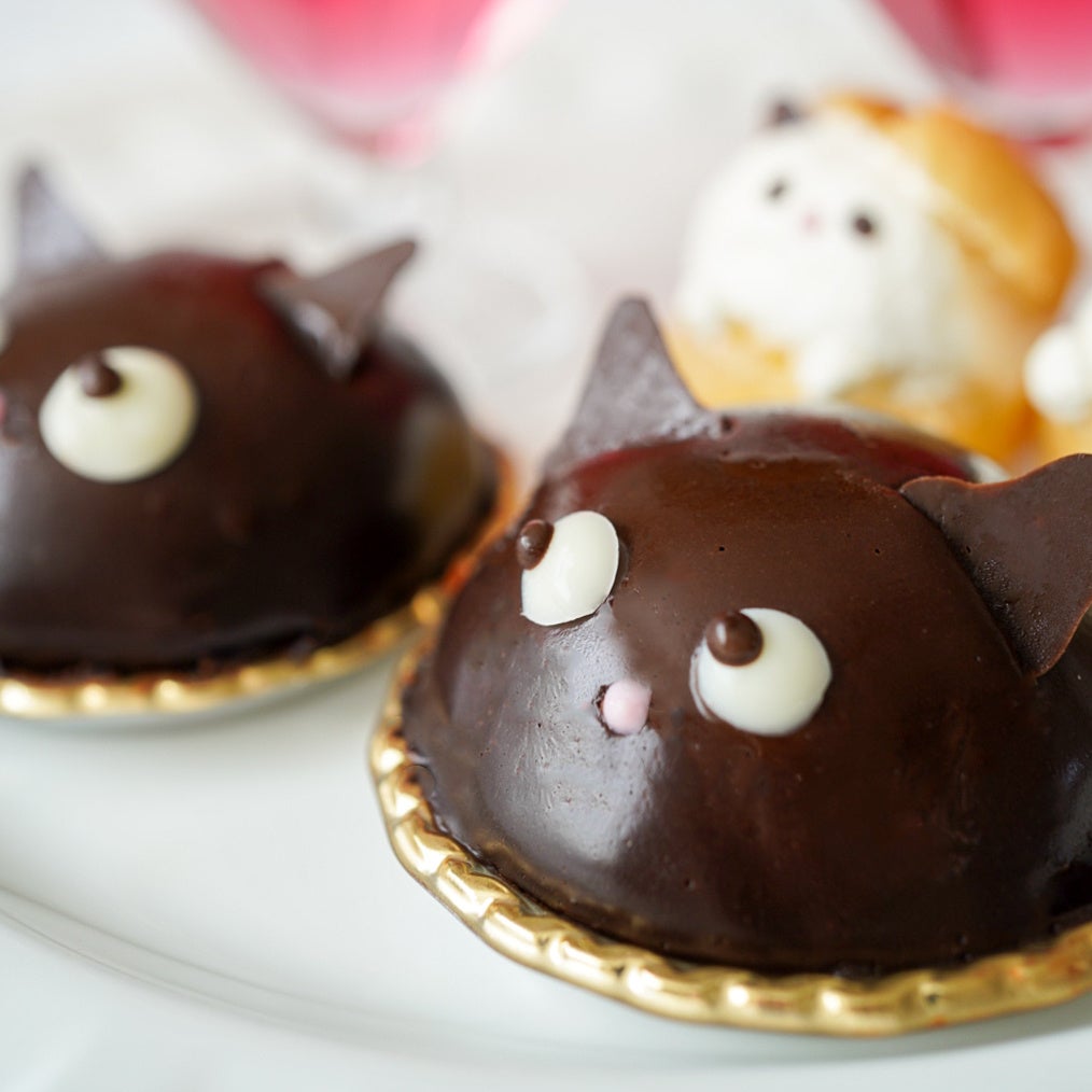 黒猫を模したドーム型のチョコレートムースは、濃厚なカカオの風味がバレンタインシーズンにぴったり。白猫がひょっこりのぞくプチシューや、猫耳をイメージしたいちごゼリーなど、フォトジェニックでSNS映えもバッチリのラインナップとなっています。