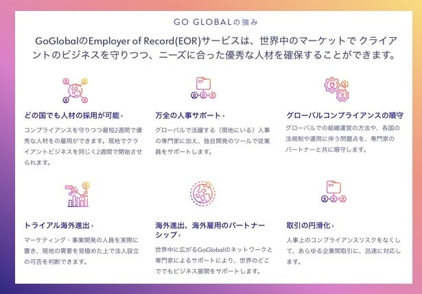 GoGlobalは日本企業初の海外雇用代行サービス (EOR=Employer of Record) 会社として2018年に設立。現在、世界100カ国以上でサービスを展開し、日本企業の海外進出をサポートするEORのリーディングカンパニーです。EOR は、世界各国で優秀な人材を現地法人設立せずに雇用することを可能にし、従来型の海外進出において発生する費用・時間の大幅な削減をしながら、最短2週間で海外進出・海外雇用ができるサービスです。リクルーティングサービスも提供しており、事業ニーズに合わせて各国で適切な人材の求人、雇用・人事管理まで一気通貫のサポートが可能です。各国のコンプライアンスを順守し、バックオフィス業務を不要にし、クライアントのコアビジネスの成長に注力できる体制を提供できる事も私たちの強みです。GoGlobalはこれからの時代の海外人材雇用の新しいスタイルを提案していきます。