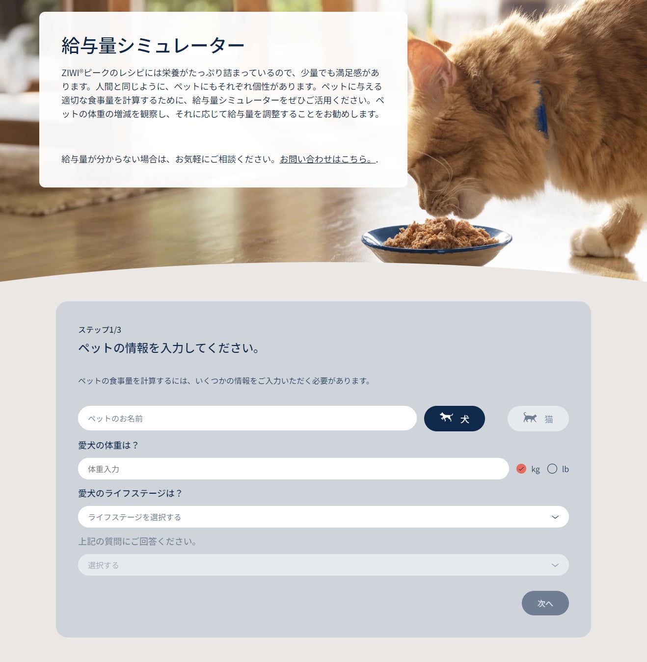 新ウェブサイトでは、デザインとページの構成を見直したほか、新機能のペットの体重や年齢、運動量などを入力すると、適切な給与量がわかる「給与量シミュレーター」を追加し、ペットオーナーの利便性を高めました。