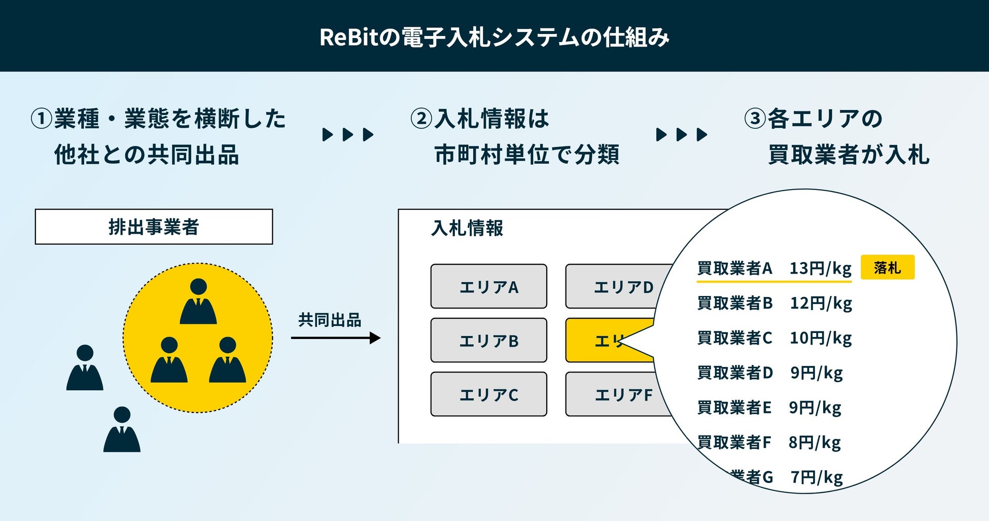 競争社会から協業社会へ時代が変遷し、動脈分野では共同配送など他社間連携が活発化されてきています。そんな中、静脈分野についても、業種・業態を超えた他社との共同出品により、資源物を多く集める仕組みができれば、排出事業者様および資源買取業者様の双方にメリットがあるサービスをご提案できるのではないかと思い、「ReBit Auction」のリリースを決定しました。