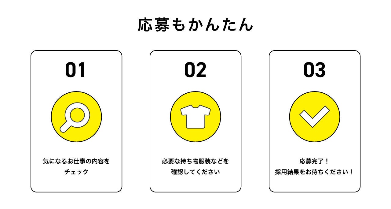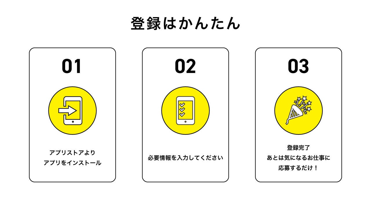 スタッフ登録は、本人確認、仕事のお申し込み、入金まですべてアプリで完結(面接不要)。