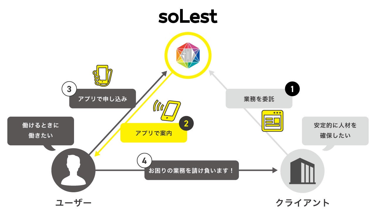 登録や案件応募、勤怠管理から入金まで、すべて専用アプリで完結しています。働きやすさを徹底的に追求したシステムで、学生・フリーター・ダブルワークの社会人・主婦・主夫などが求める「シフトに拘束されない働き方」を実現し、人々が持つスキマ時間を有効活用し、地域経済に貢献するビジネスを展開しています。