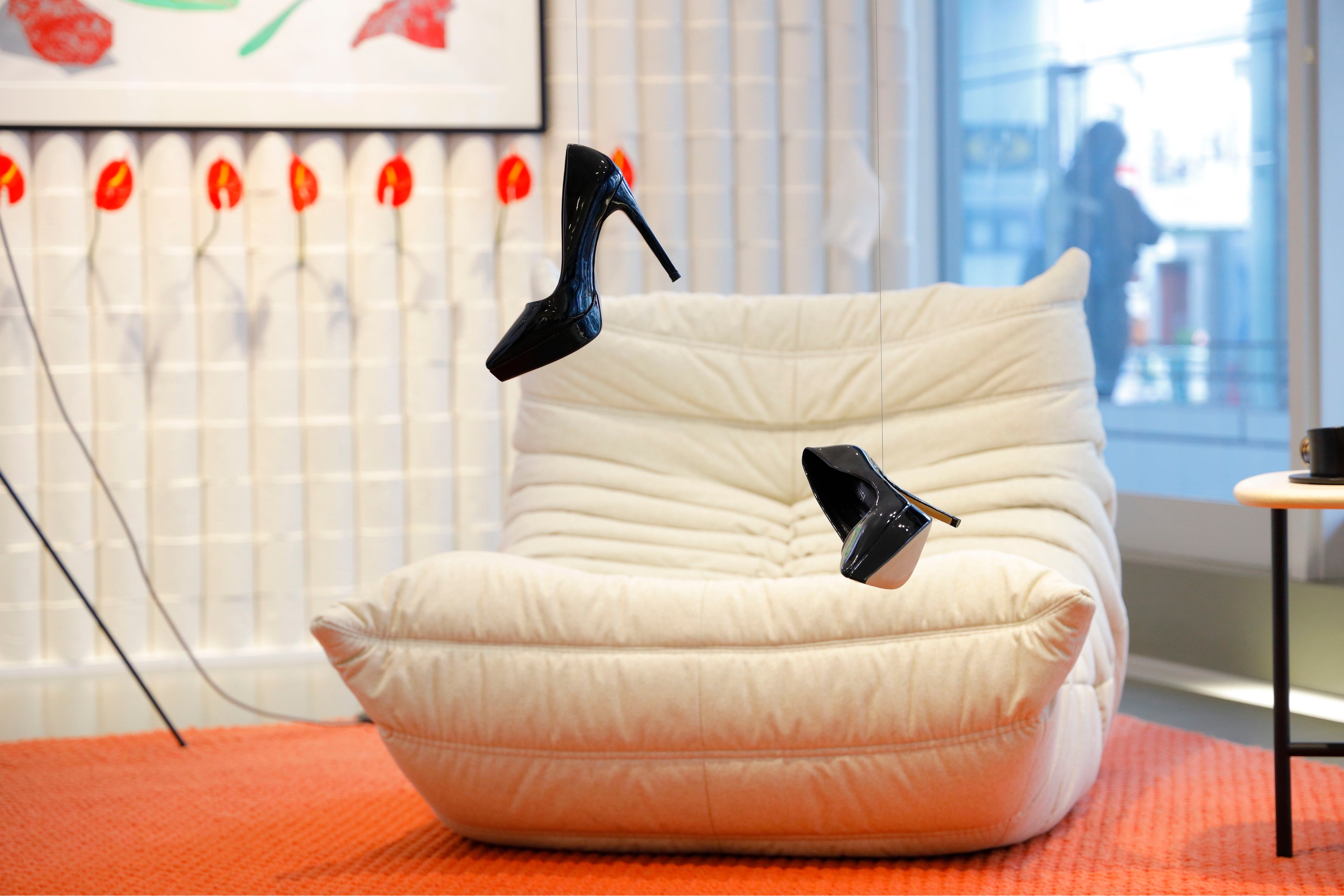 ④ 天井から吊るされた2足のハイヒール