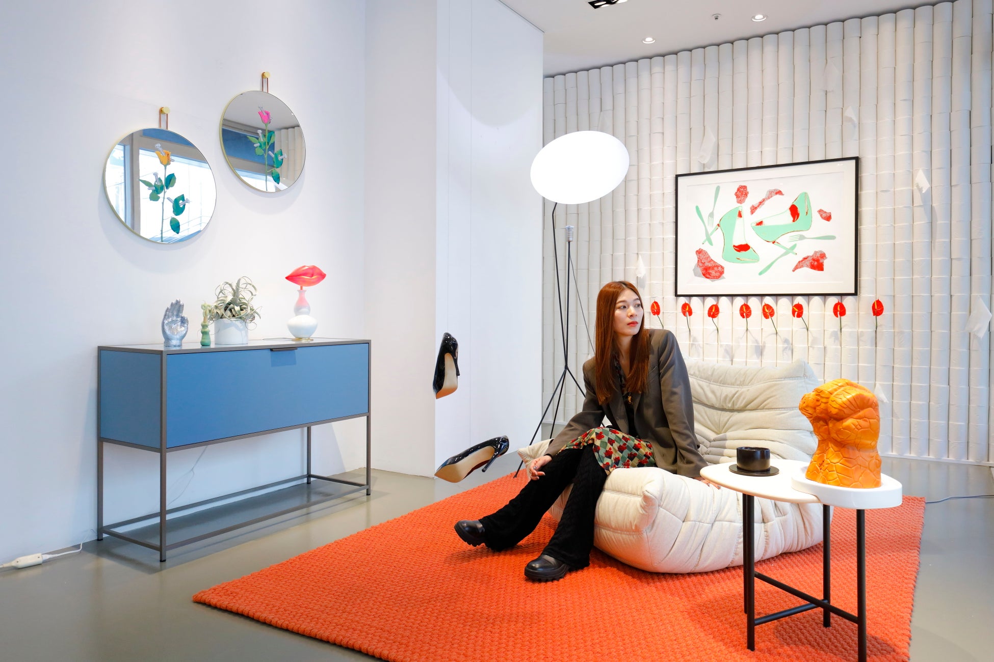 ロゼトーゴの目の前にはハイヒールが2足。「靴が浮いていたらかわいいなと思いついて、自宅でしてみたいけど、流石にできないので今回の部屋で吊るしてみました」とのこと。作品制作を通して改めて自分は何が好きなのかを知ることが多いそうで、壁に飾られたシルクスクリーンのポスターにもハイヒールの絵が描かれています。