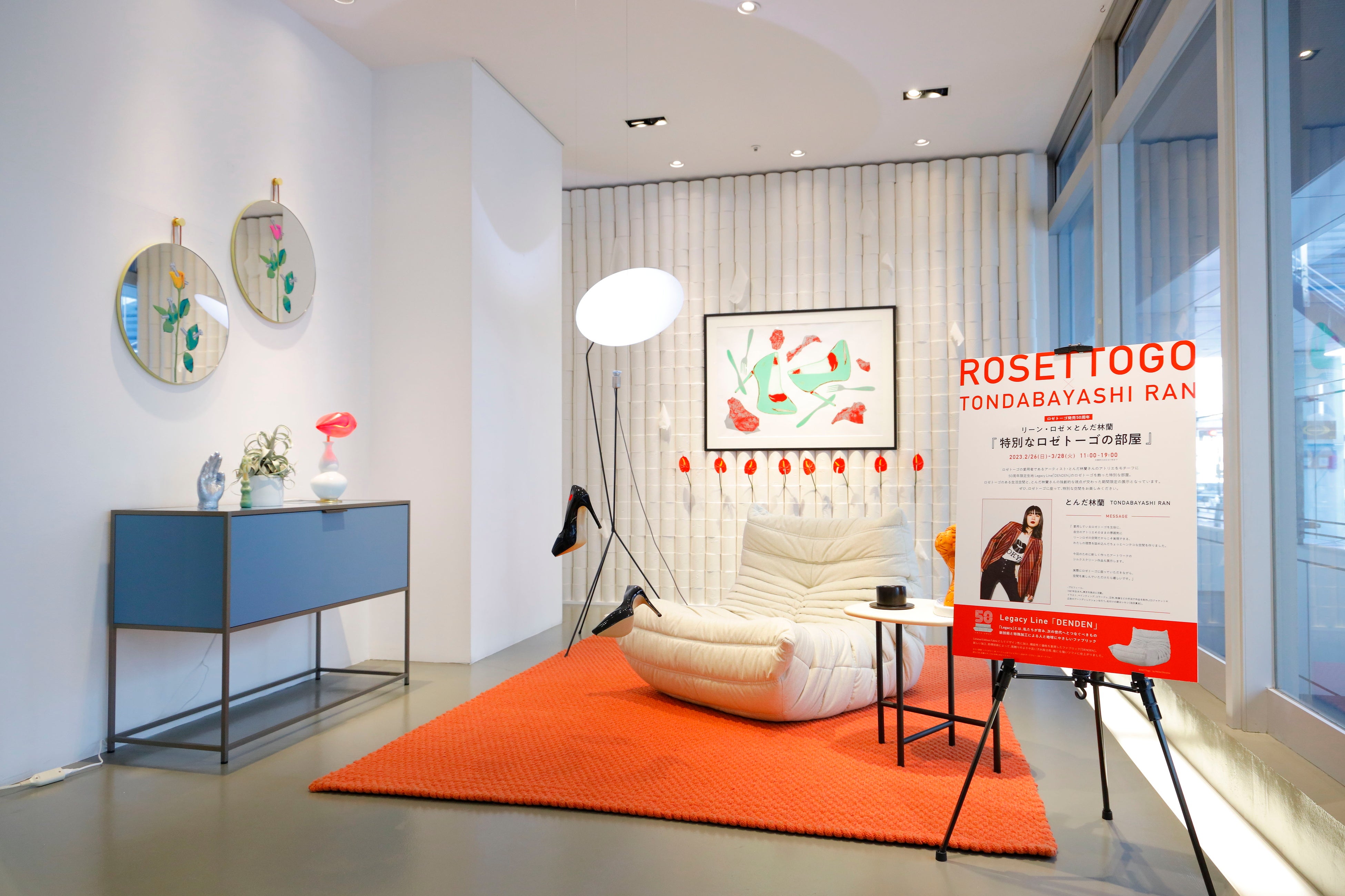 とんだ林蘭さんの独創的なアイデアが生まれるアトリエをモチーフとした『特別なロゼトーゴの部屋』には、今回の企画のために新たに制作したシルクスクリーンのポスターやリーン・ロゼのミラー『ROSETSperl』にシルクスクリーンを施した作品などが飾られています。また部屋の中心にはリーン・ロゼが50周年を記念して展開する限定生地『DENDEN』を使用したロゼトーゴが置かれており、実際に座って特別な空間をお楽しみいただけます。