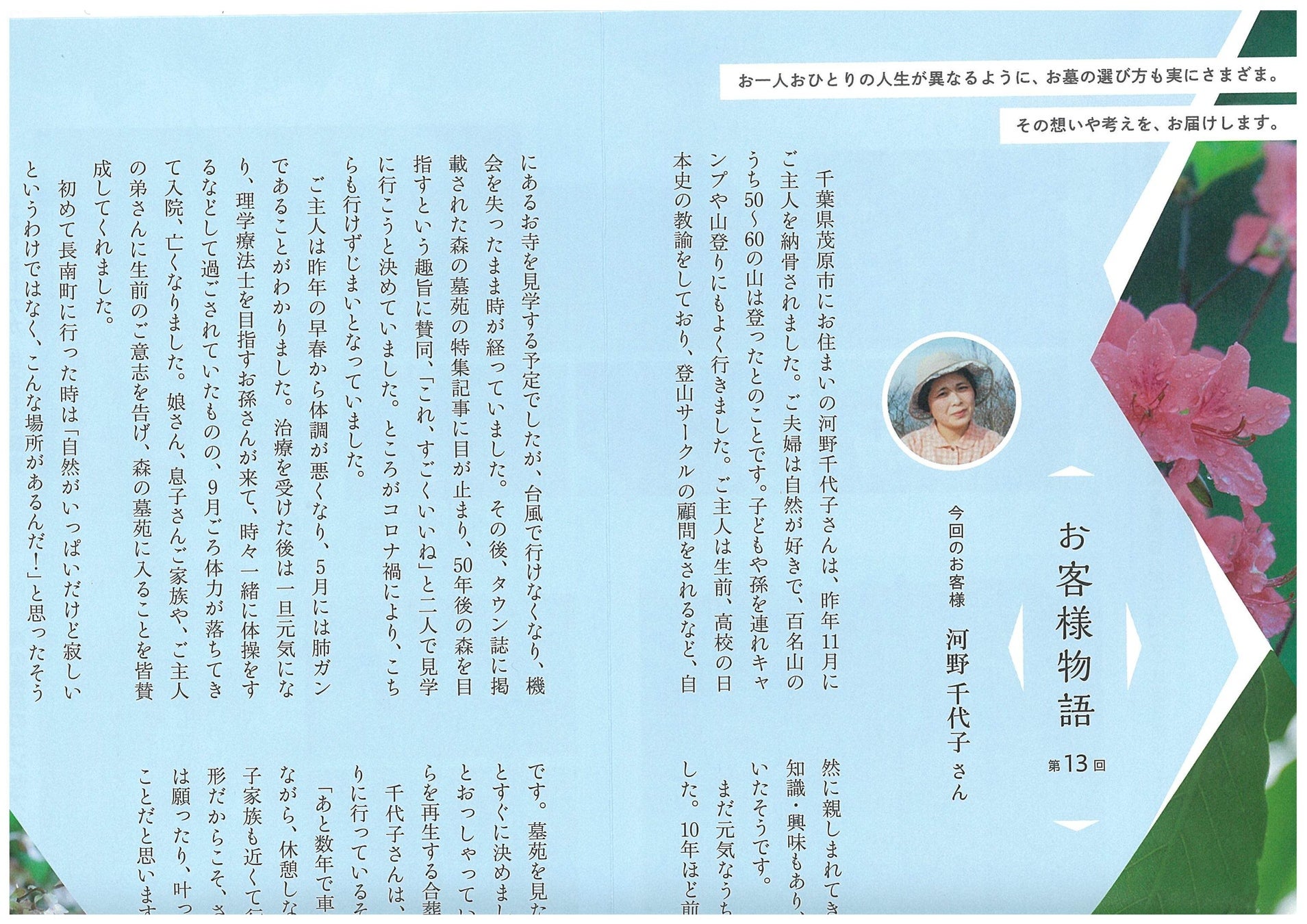 お墓選びの生の声を知ることができる貴重なインタビュー記事「お客様物語」は、自然好きだったご主人を埋葬された千葉県茂原市にお住いの方のお話を掲載しています。