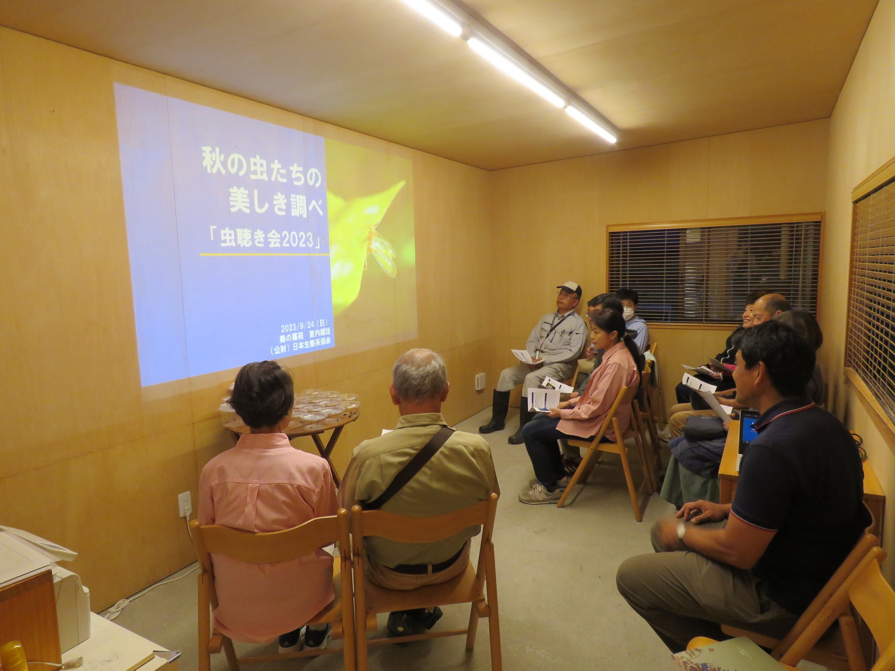 管理棟内で、鳴く虫の種類や生態、人とのかかわり等について日本生態系協会の専門スタッフが